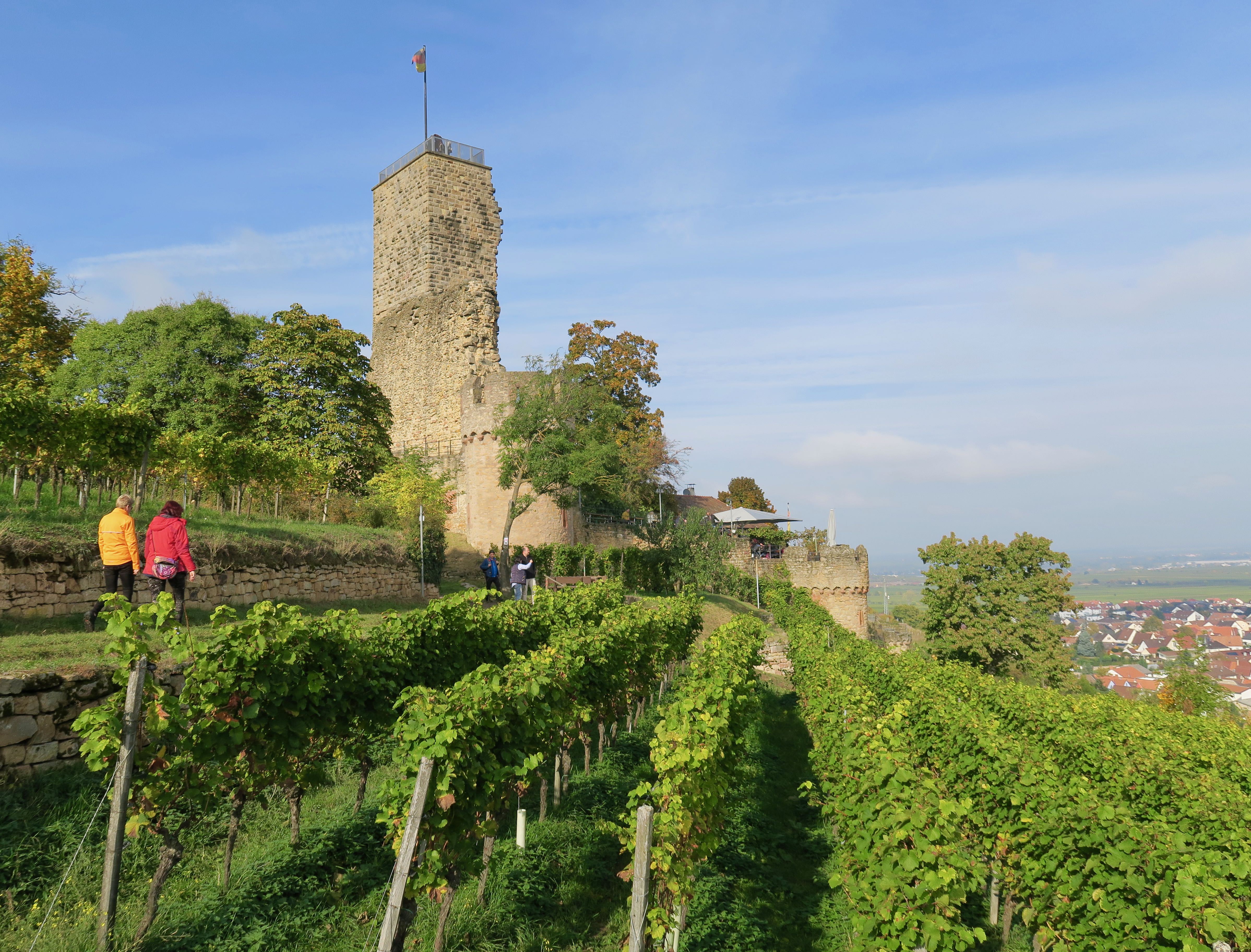 Balkon am Pfälzerwald: Im renommierten Weindorf Wachenheim blieben Reste zweier imposanter Wehrbauten erhalten, zum einen Überreste des mittelalterlichen Mauerrings um den Ort und zum anderen die Burgruine oberhalb des Orts, die weithin sichtbare Wachtenburg. Ihr wuchtiger, 30 m hoch aufragender Bergfried steht nur zur Hälfte noch, in der zweiten Hälfte des 15. Jahrhunderts hatten kurpfälzische Truppen die Burganlage zerstört. Im Jahr 1689, im Krieg um das pfälzische Erbe der Kurfürstentochter Liselotte, sprengten französische Soldaten den stehengebliebenen Turm. Eine Treppenanlage führt hinauf zur Aussichtsplattform, doch vielen Wanderern und Radlern reicht schon die Aussicht von der Burgschänke – auch von den Biergartenbänken blickt man weit über Rebflächen und Rheinebene. An schönen Tagen zieht das fantastische Panorama von einem der schönsten »Balkone« der Pfalz jede Menge Ausflügler an, die sich von den laut ausgerufenen Nummern für die bestellte Wegzehrung die gute Stimmung nicht verderben lassen. Wer sich genauer für die Rettung der einsturzgefährdeten Burg interessiert, die Mitte der 1980er-Jahre von Gemeinde, Förderverein und Landesdenkmalpflege in Angriff genommen wurde, besucht das kleine Burgmuseum (www.wachtenburg.de, www.stadtmauer-wachenheim.de). Für Burgenfans und Pfalz-Urlauber: Ebenfalls einen Umweg wert ist die Schloss- und Festungsruine Hardenburg.