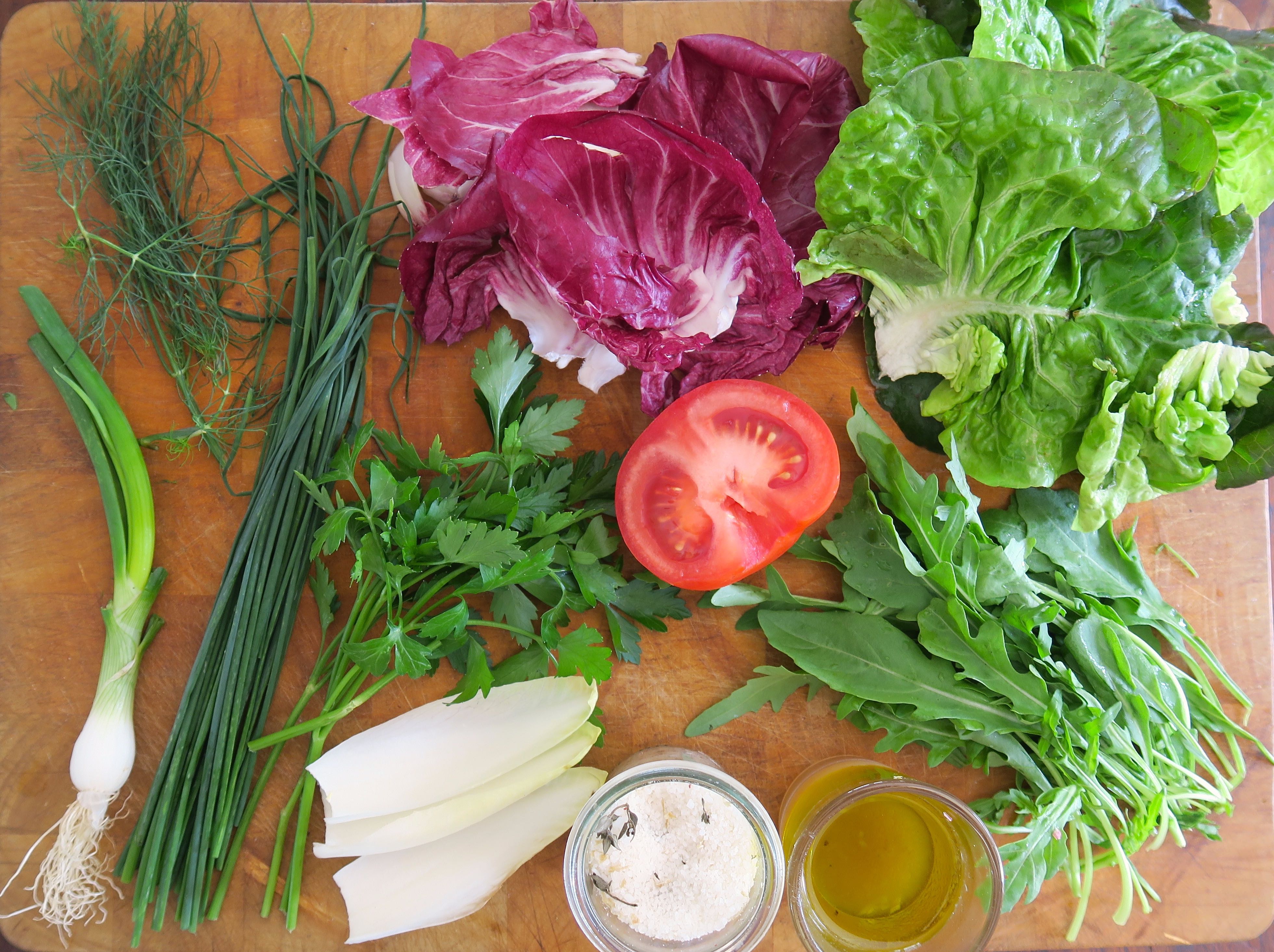 Bitter schmeckt besser: Für einen gemischten Blattsalat mit Essig und Öl braucht kein Mensch ein Rezept. Einfach verschiedene Blattsalate, Radicchio, Rucola und Chicorée in Streifen schneiden, Kräuter und Vinaigrette zufügen, fertig. Gibt’s bei mir mindestens jeden zweiten Tag. Wenn ich für mich alleine Salat mache, sehe ich zu, dass der Anteil bitterer Sorten wie Endivie, Rucola, Radicchio, Chicorée oder Gartengurke mit Schale möglichst hoch ist. Leider ist unter den fünf Geschmacksrichtungen – süß, sauer, salzig, bitter, umami (herzhaft) – bitter wohl die am wenigsten populäre. Meinen »Mitessern« schmeckt es jedenfalls besser, wenn der Anteil »neutraler« grüner Blattsalate überwiegt wie Romana-, Eichblatt- oder Feldsalat. Ansonsten sorgen roter Mangold, Babyspinat, Frisée und der weiße Radicchio (di Castelfranco) für Abwechslung. Nur Eisbergsalat kommt mir nicht in die Salatschüssel. Die halbe Tomate – in kleine Würfel geschnitten – ist ein Küchentrick, um weniger Öl zu verwenden. Ein guter Weißweinessig und hochwertiges Olivenöl, Salz und Pfeffer, das war’s! Auch Frühlingszwiebeln oder Knoblauch, 1 TL Senf oder 1 EL griechischer Joghurt passen gut in die Vinaigrette, für noch mehr Aroma sorgen auch eine fein gewürfelte Stange Staudensellerie oder fein gehobelter Fenchel. In Frankreich ist ein gemischter Blattsalat als »Mesclun« ein Klassiker.