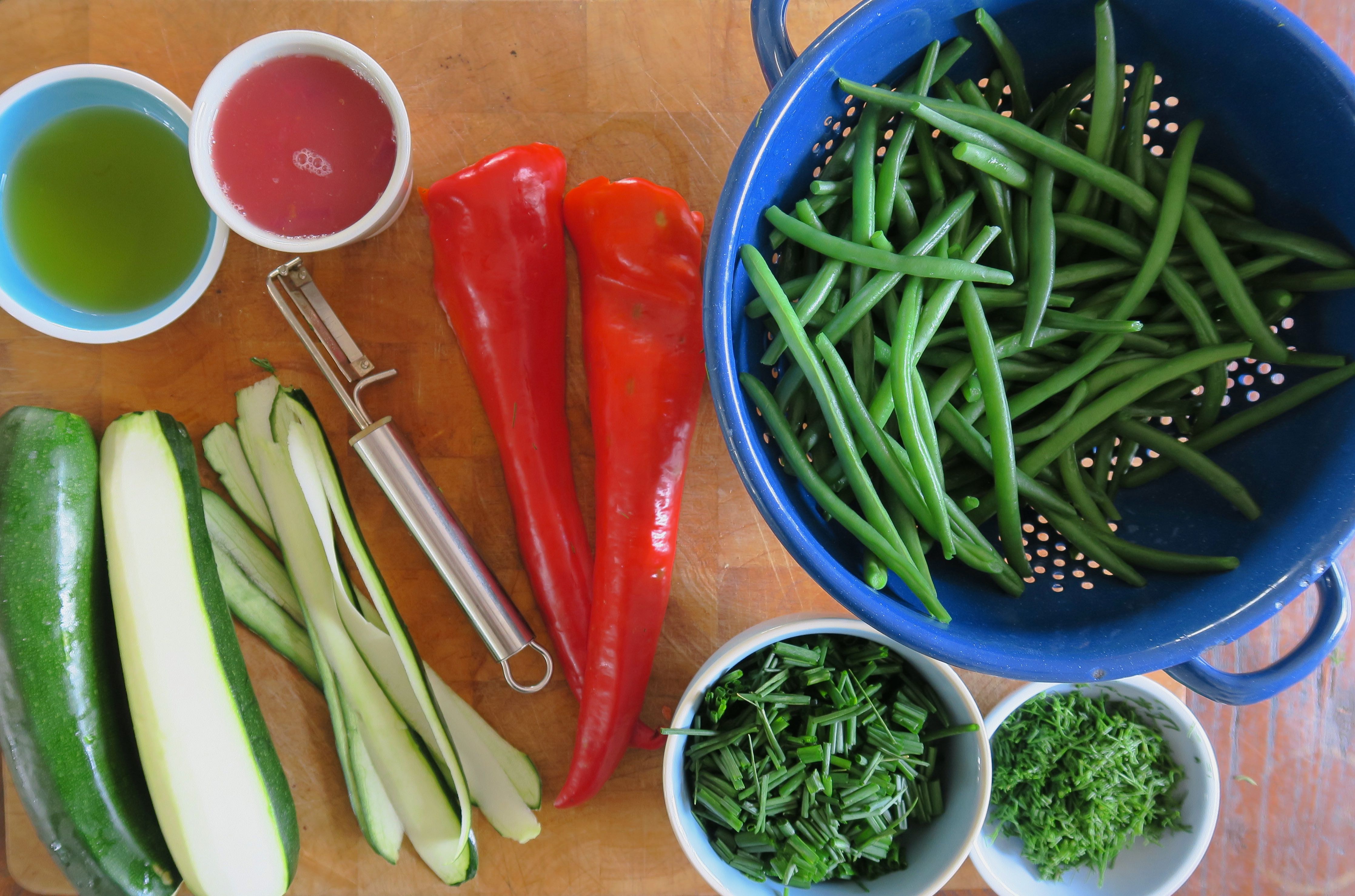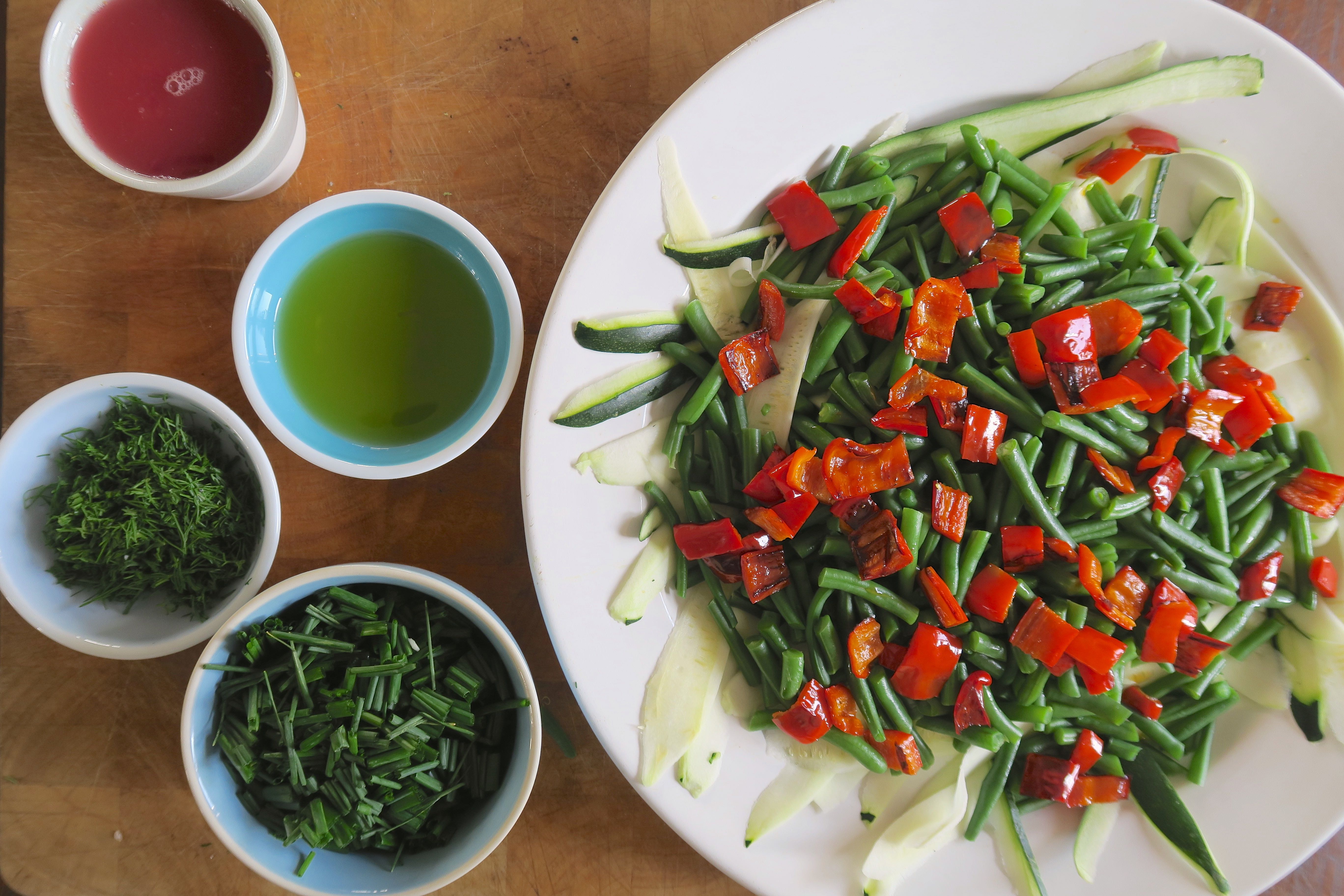 Den Dill fein hacken, den Schnittlauch in feine Röllchen schneiden. Die Zucchini mit dem Sparschäler längs in dünne Streifen schneiden und auf einem flachen Teller anrichten. Die Bohnen und die Paprika darauf verteilen, mit dem Dressing beträufeln und etwas ziehen lassen. Den Salat mit den Kräutern bestreuen und servieren.