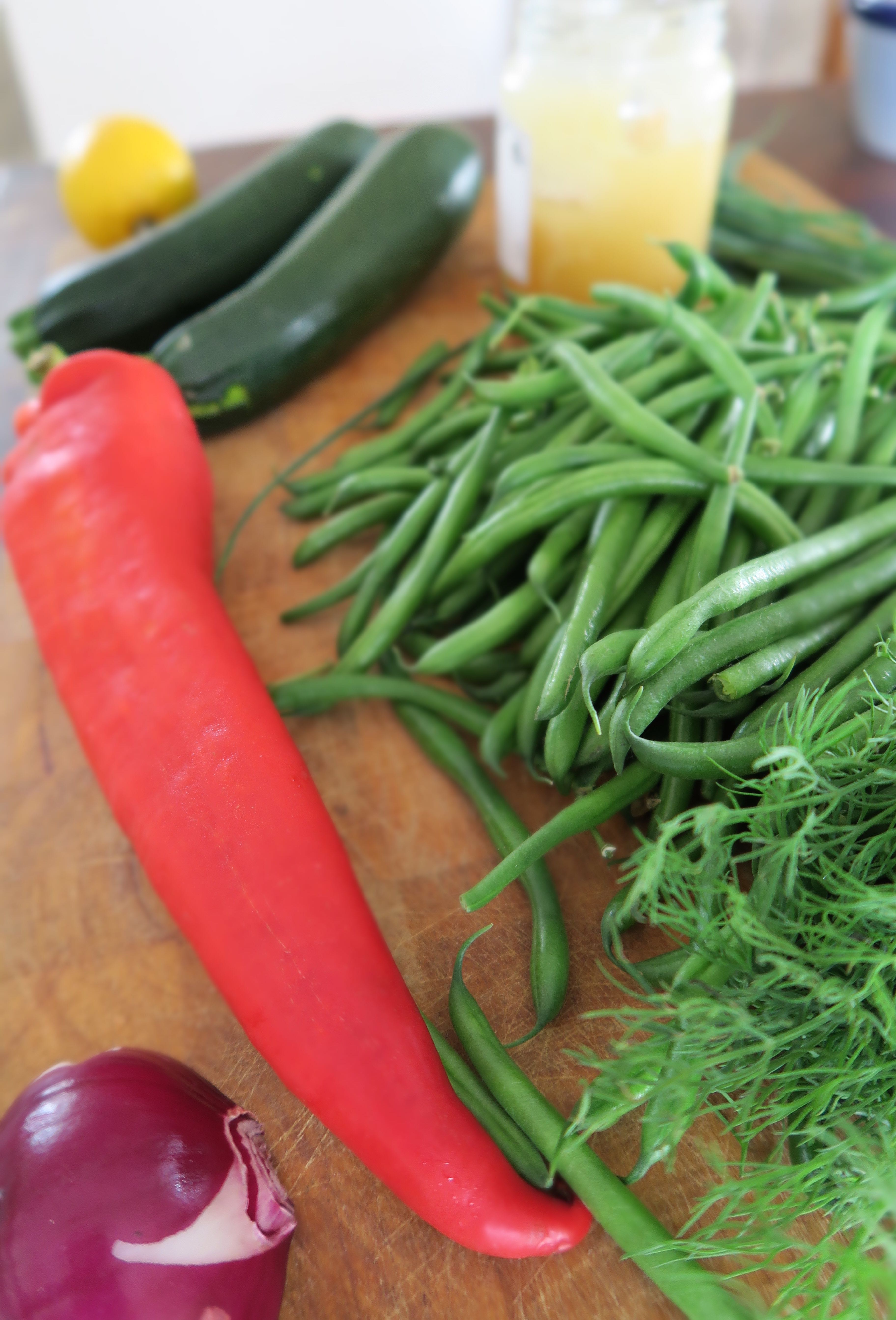 2 große Handvoll grüne Keniabohnen • 1 rote Paprika • 4 EL Olivenöl