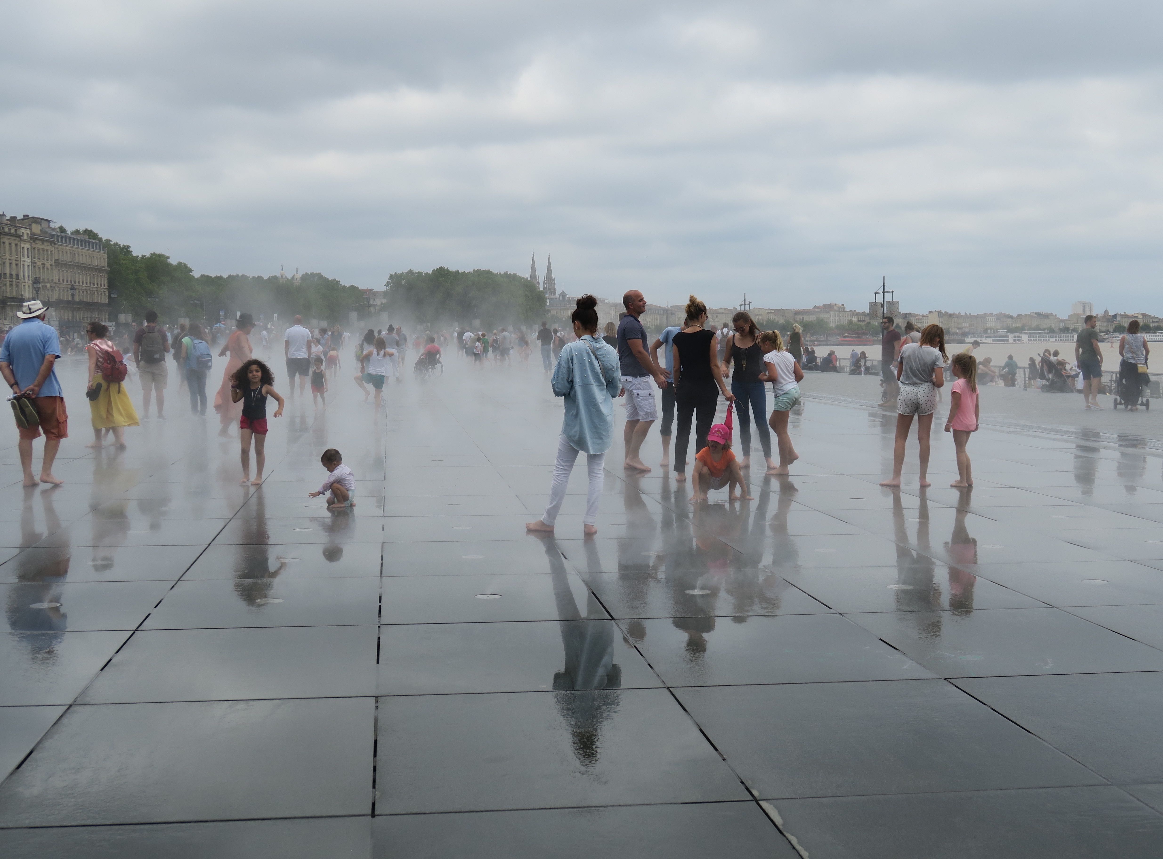 Nizza, Paris, Nantes, Montpellier: Nicht nur in Bordeaux ist der Miroir d’Eau eines der Highlights, das Anklang bei Groß und Klein findet, Einheimische und Touristen gleichermaßen fasziniert. Der Spiegeleffekt der Wasserflächen und die Nebel sprühenden Brumisateurs zählen auch auf der Promenade du Paillon in Nizza bei Hobby- wie Profifotografen zu den beliebtesten Motiven. 2013 in Betrieb genommen und mit 3000 m2 fast genauso groß wie in Bordeaux wurde dort zusätzlich noch Lichttechnik installiert, die die in Frankreich so beliebten »Son et Lumière«-Shows möglich macht. Auch in Nantes und in Montpellier wurden ähnliche, wenn auch kleinere Brunnenanlagen gebaut, in Paris auf der neu gestalteten Place de la République. Der nur 270 m2 große Miroir d’Eau ist ebenfalls ein beliebtes Planschbecken, doch dient er weniger dem Spiegeleffekt als – wie die angepflanzten Bäume – dem Versuch, die Lufttemperatur abzusenken. Seit der Fertigstellung ist es auf der einstigen Hitzeinsel (»ilot de chaleur urbain«) im Sommer merklich kühler. Der zuvor vom Autoverkehr dominierte Knotenpunkt war ein Ort ohne Aufenthaltsqualität, nach dem Umbau verwandelte sich der weitläufige Platz in eine zwei Hektar große Esplanade mit Bänken und einem Café. Die Place de la République ist für die Pariser nun ein Ort zum Entspannen; seit den Attentaten im Jahr 2015 kommen sie aber auch hierher, um zu trauern – oder um zu protestieren: Für die »Nuits debouts« (wörtlich der aufrecht verbrachten Nächte, also während man wach bleibt), die nächtlichen Versammlungen als Protest gegen Arbeitslosigkeit und soziale Ungleichheit, ist die Place de la République das Epizentrum der Bewegung. Demnächst sollen solch eine Verjüngungskur auch die Place de la Bastille und Place de la Nation erhalten.