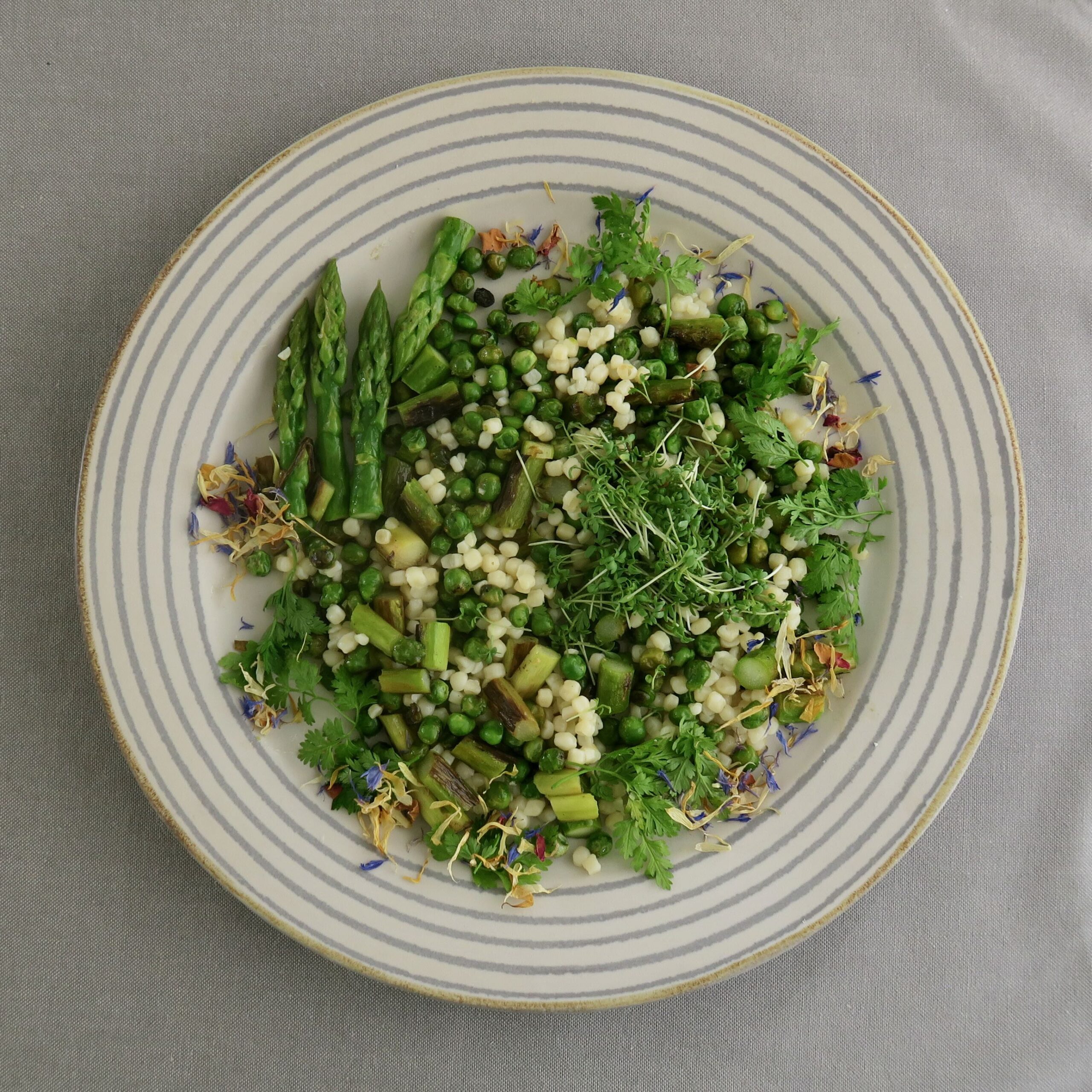 Röstaromen: Erbsen habe ich noch nie gebraten gegessen. Nachdem ich es aber in gleich zwei Kochbüchern in Rezepten als Zubereitungsweise entdeckt hatte, habe ich es für diesen Salat mal ausprobiert. Denn klar, Fett ist Geschmacksträger Nummer 1, und was für Spargel, Blumenkohl und Möhren funktioniert, kann auch für Erbsen zutreffen. Zusammen mit dem grünen Spargel habe ich sie in einer großen Pfanne mit genug Platz für das Gemüse richtiggehend gebraten. (In einem ähnlichen Rezept mit Zucchini und Avocado statt Erbsen habe ich den Spargel roh gelassen.) Tatsächlich schmeckte der Salat sehr gut, doch den feinen Geschmack von frischen, selbst gepalten Erbsen würde ich eher nicht so mit Röstaromen überdecken wollen – Wurzelgemüse oder der robuste grüne Spargel vertragen es besser. Mit Fregola Sarda, den Pasta-Kügelchen aus Sardinien, ergaben die Zutaten einen grünen Frühlingsnudelsalat, Limette, Kresse und viel Kerbel steuern Frische und Würze bei. Für 2 Personen:
