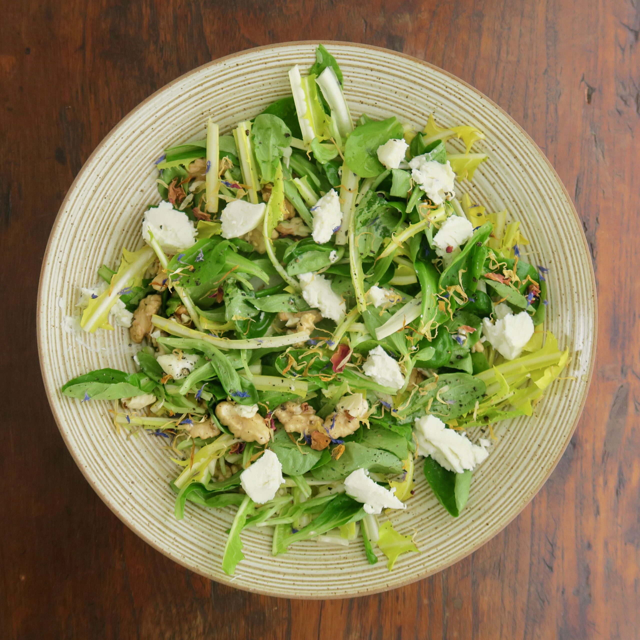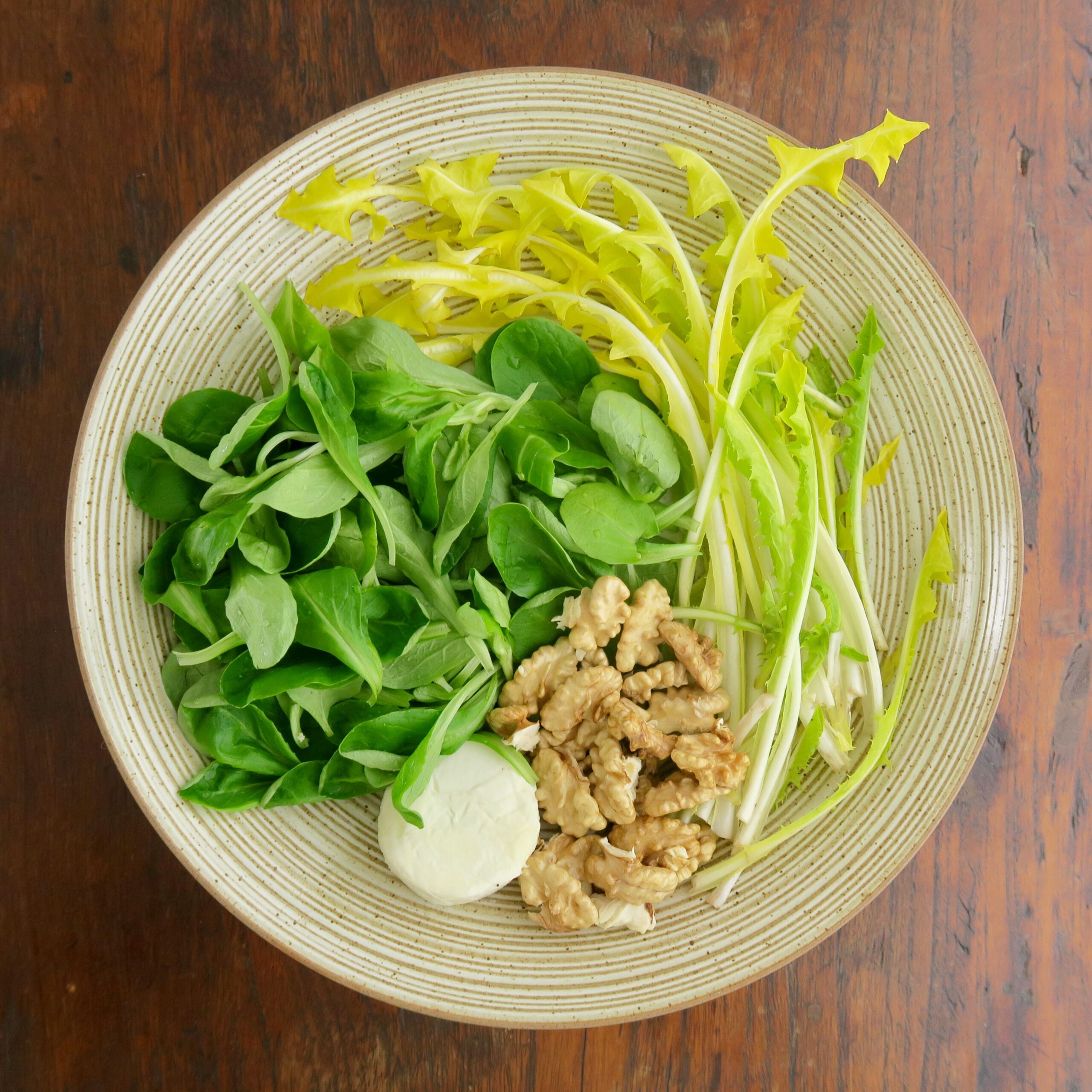 FELDSALAT, LÖWENZAHN, WALNÜSSE, ZIEGENFRISCHKÄSE