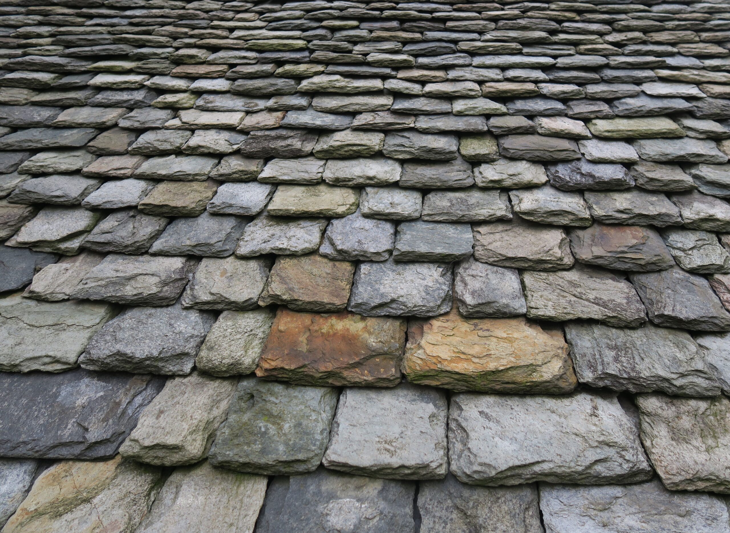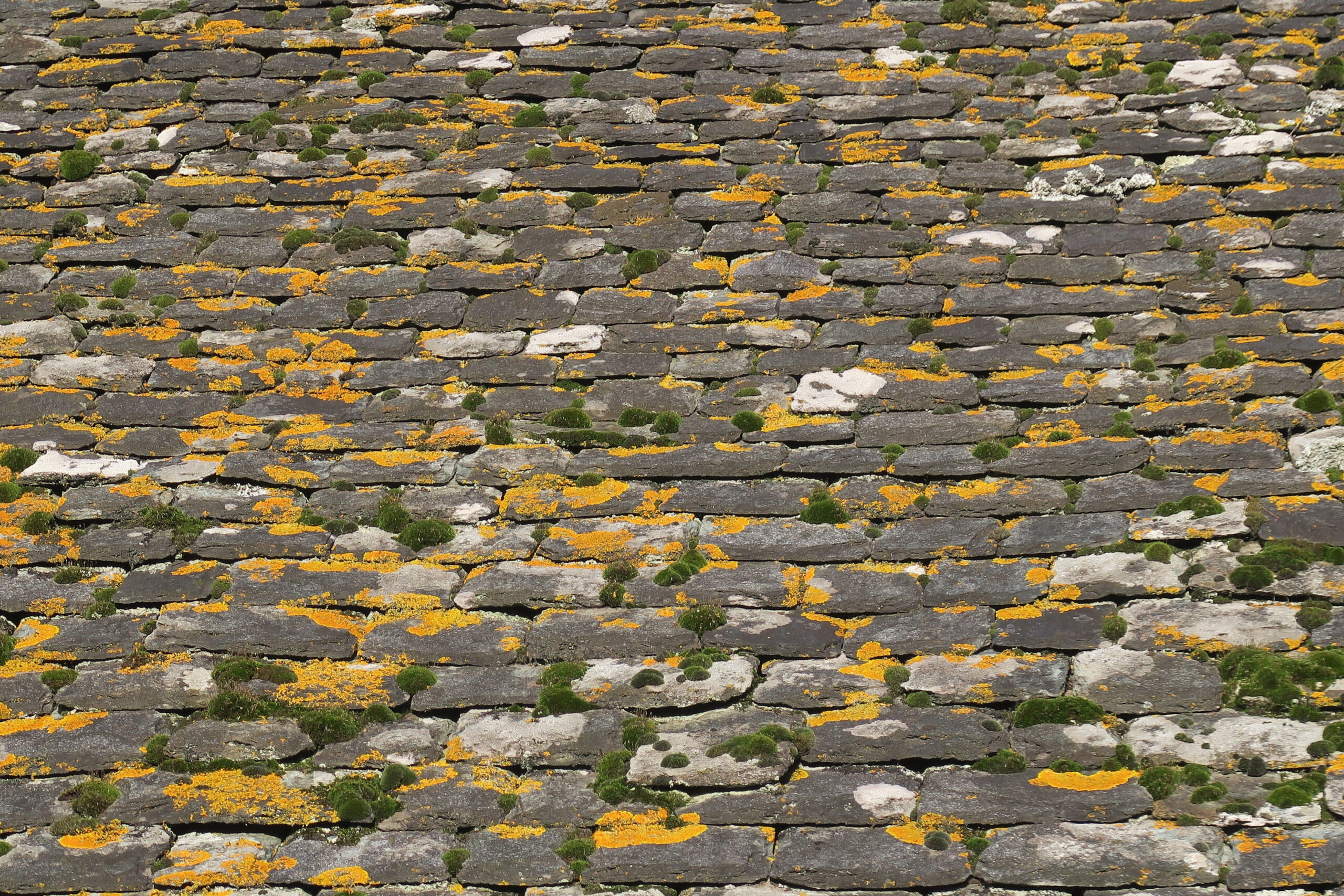 Moosbedeckte Schieferdächer: Wie die einzelnen Schiefersteine so verlegt werden, dass das Regenwasser abfließt, dafür haben sich im Laufe der Jahrhunderte unzählige verschiedene Varianten etabliert, beispielsweise die Rechteck-Doppeldeckung. Bei historischen Dacheindeckungen ist häufig zu sehen, dass die sich überlappenden Schieferplatten nach oben zum First immer kleiner werden. Es gibt jedoch selbst in der Bretagne kaum noch Handwerker, die die traditionelle Verlegetechnik mit von Hand zugerichteten, sehr dicken Platten beherrschen. In der Bretagne weit verbreitet ist es, Schiefer mit anderen Materialien kombiniert zu verlegen, so sind keramische Firstziegel keine Seltenheit. Eine Rarität geworden sind dagegen Giebel- und Fassadenverkleidungen aus Schiefer, wie sie beispielsweise noch in Lannion oder Le Faou zu sehen sind.
