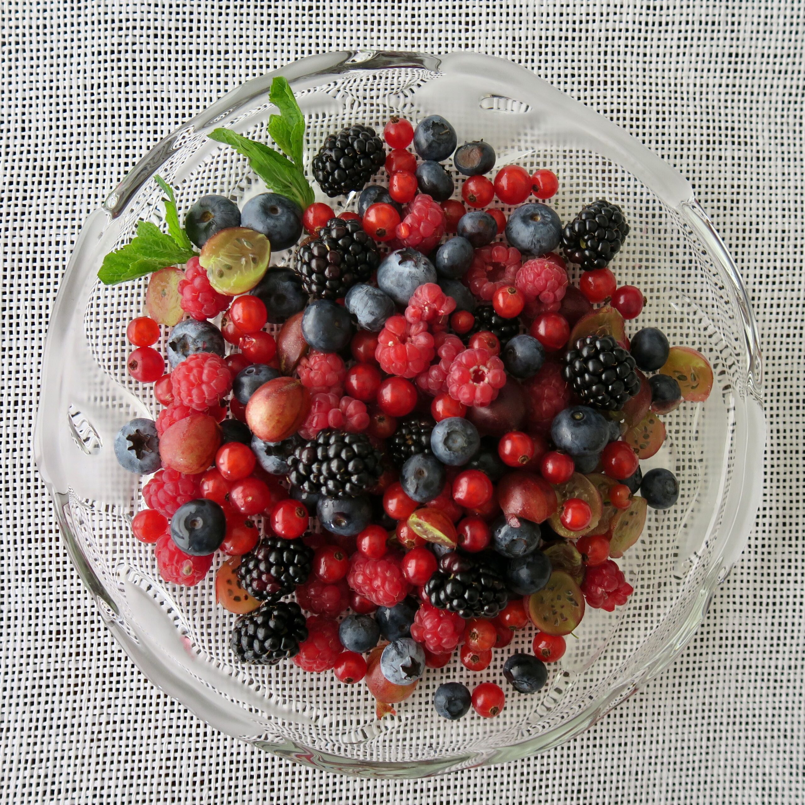 Sommerbeeren: Zu meinen schönsten Kindheitserinnerungen, was Beeren angeht, zählt neben dem intensiven Geschmack winziger Walderdbeeren bei (verhassten) Wanderausflügen die Pilz- und Blaubeersuche im Wald in Kärnten. Wir wohnten auf einem echten Bauernhof bei entfernter Verwandtschaft auf einer Anhöhe zwischen Wörthersee und Keutschacher See, und gleich dahinter begann der Wald. Auch um Semmeln beim Bäcker zu holen, musste man auf Waldpfaden weit hinunter von der Höhe mit weitem Blick. Pilze mochte ich als Kind nicht, aber die Pfifferlinge waren so schön leicht zu finden. Und die niedrigen Blaubeersträucher bedeckten einfach den ganzen Waldboden. Mit kleinen Eimerchen und Körben ausgestattet ging es in den Wald hinein, mit unübersehbaren blauroten Spuren im Gesicht kamen wir wieder heraus. Auf dem Biomarkt bekommt man natürlich nur Kulturbeeren, aber auch damit ist die Beerenmischung schon für sich allein ein großartiger Obstsalat. Besonders gut schmeckt er mit etwas Minze und einem (wegen der säuerlichen Johannis- und Stachelbeeren) leicht gesüßten und mit Limettensaft verrührten griechischen Joghurt als »Dressing«. Wer lieber Schlagsahne oder Eiscreme dazu servieren möchte, kann einige Früchte durch ein Sieb streichen und mit etwas Puderzucker verrühren, um etwas mehr »Sauce« zu haben.