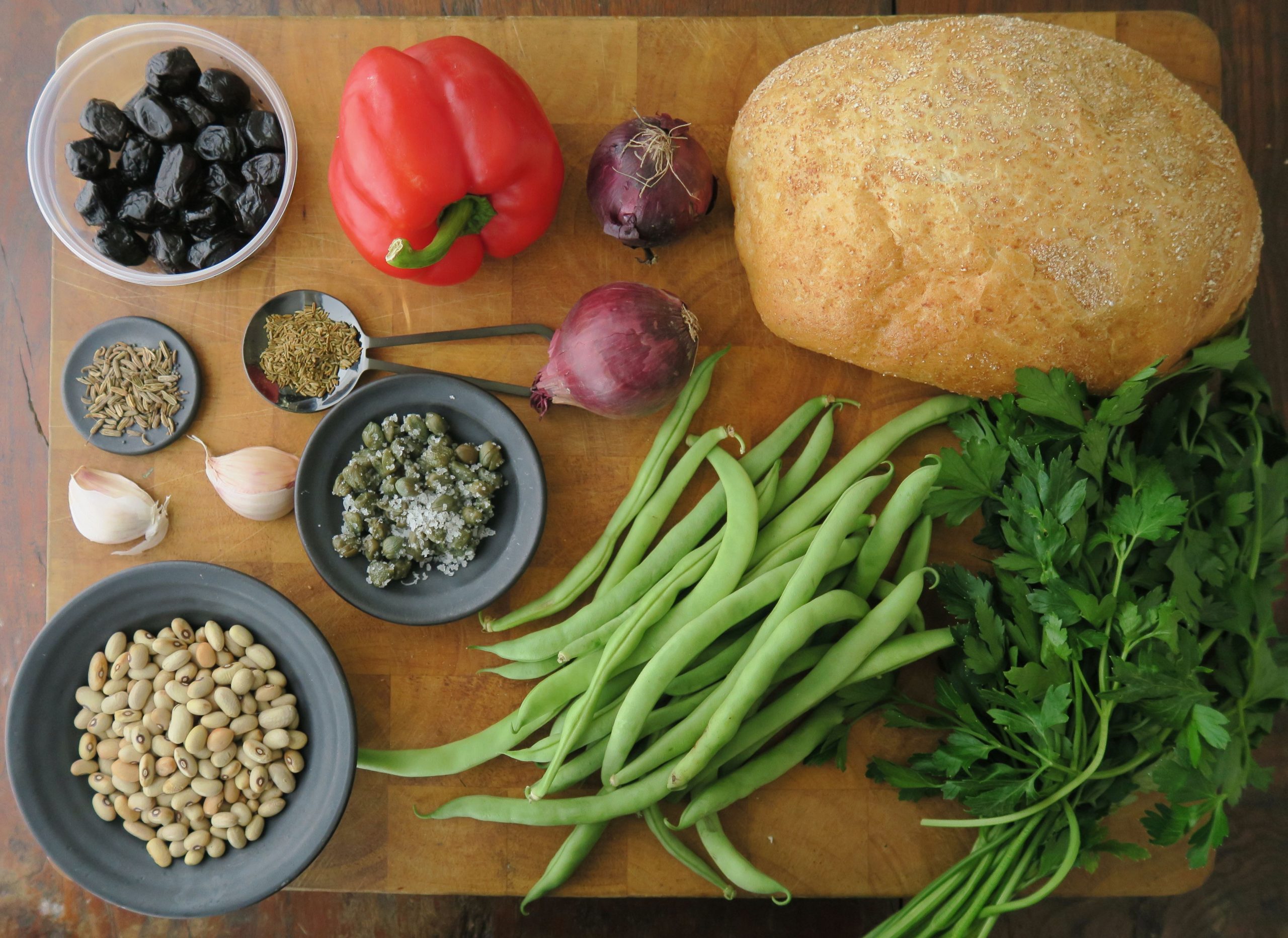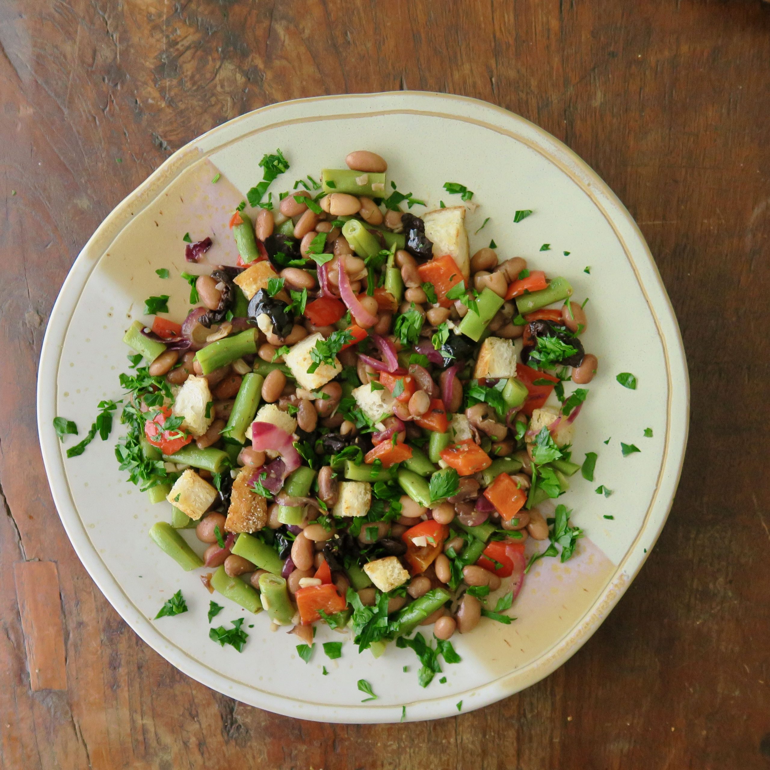 Gemüseküche vom Mittelmeer: Statt Kräutern wie Basilikum oder Bohnenkraut würzen den Salat die Aromen des Orients, und geröstete Weißbrotwürfel mischen sich unter zweierlei Bohnen. Weil es anders als beim Panzanella kaum Flüssigkeit gibt, die die Brotwürfel aufsaugen könnten, muss der Salat etwas länger ziehen – die Brotwürfel bleiben trotzdem knusprig. An die zweite Hälfte des Salats habe ich zwei kleine, fein gewürfelte Tomaten gegeben – das schmeckte dann allerdings doch besser.
