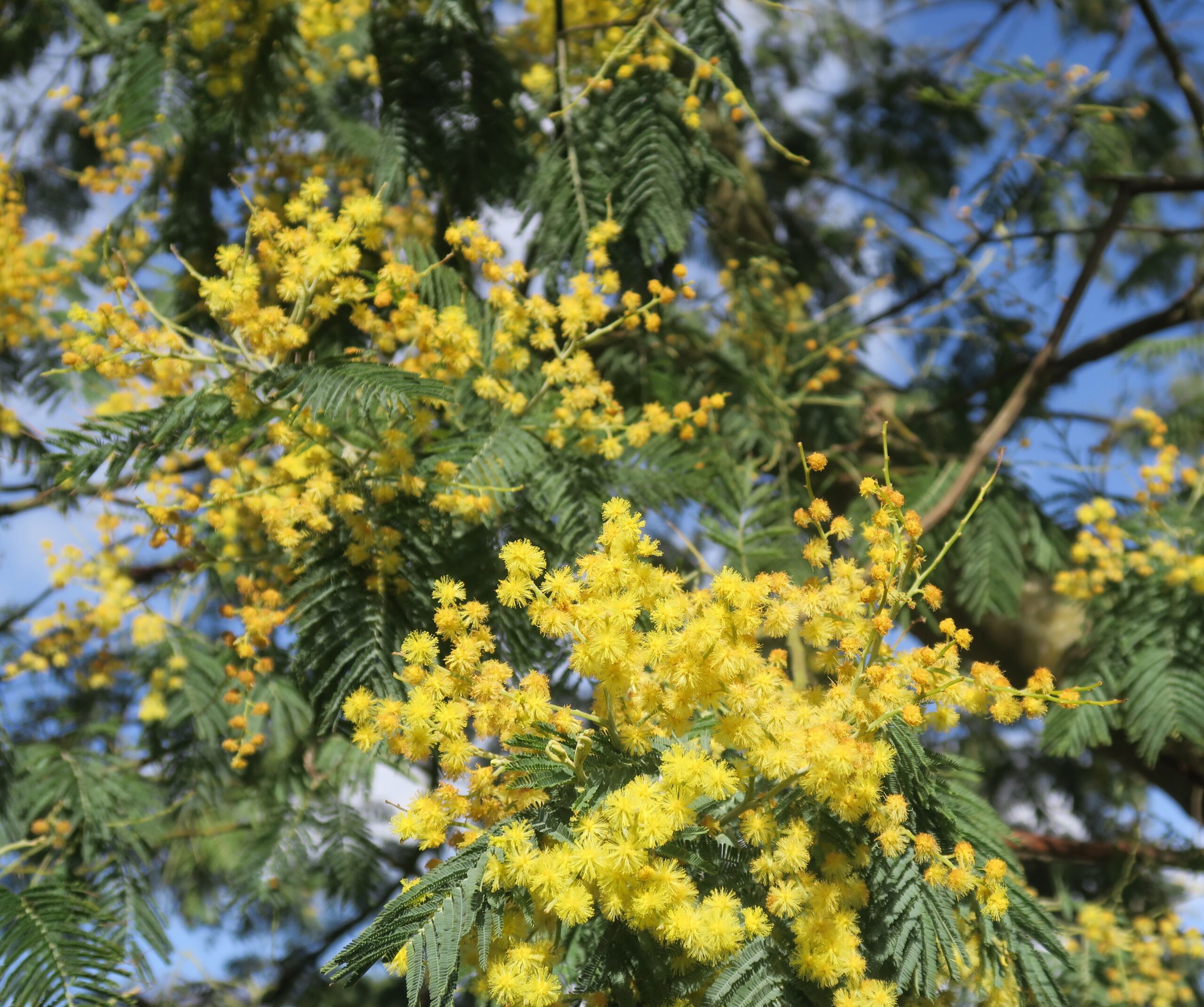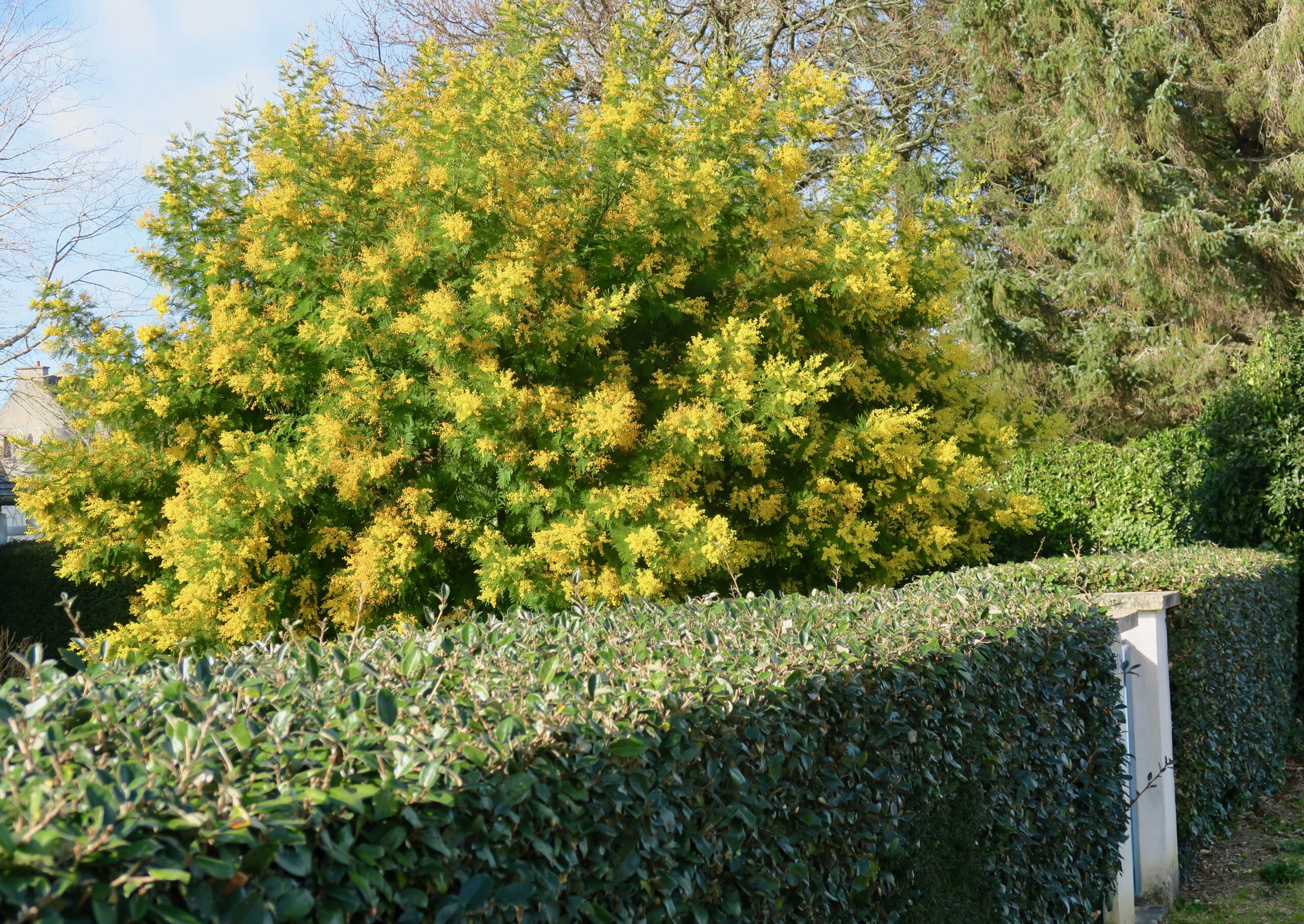 Signalfarbe: In der Bretagne ist der Baum so beliebt, weil er schon zu Jahresbeginn als Frühlingsbote üppige Farbpracht in die winterlich kahlen Gärten bringt – neben den ebenso allgegenwärtigen Kamelien. Die Silberakazie wächst schnell (30 bis 60 Zentimeter pro Jahr), kann je nach Art bis zu 20 Meter Höhe erreichen und blüht bis weit in den März hinein – mit kugelförmigen, gelben Blütenbüscheln, jede einzelne ein fedriger kleiner Ball. Im Garten bevorzugt sie einen sonnigen, windgeschützten Standort. Tatsächlich handelt es sich aber um eine invasive Pflanze, die als »Gartenflüchtling« verwildert und so einheimische Arten verdrängt (in der Schweiz beispielsweise steht sie zwar nicht wie der Kirschlorbeer auf der schwarzen Liste verbotener Neophyten, aber auf der »Watch List« der Pflanzen, die möglichst nicht verkauft oder gepflanzt werden sollen). An der Atlantikküste gefällt ihr etwa das milde Klima der Ile de Noirmoutier so gut, dass die Insel den Beinamen »île aux mimosas« zu Recht trägt.