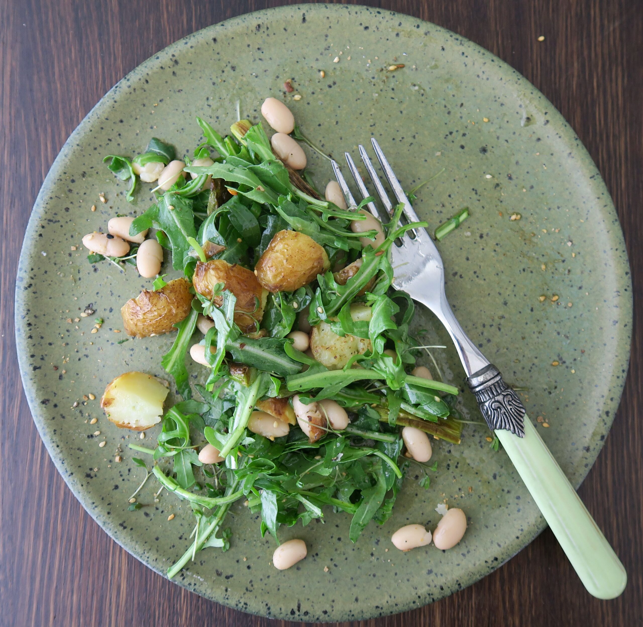 Und so geht’s: Den Backofen auf 250 Grad Celsius vorheizen. Die ungeschälten Kartoffeln gründlich abbürsten. Den Spargel im unteren Drittel schälen und eventuelle holzige Ende abschneiden. Beides auf ein mit Backpapier ausgelegtes Backbleck geben, mit 2 Esslöffel Olivenöl beträufeln und mit Salz und Pfeffer würzen. Im vorgeheizten Backofen 10 Minuten rösten, dann den Spargel herausnehmen und abkühlen lassen, die Kartoffeln wenden und im Ofen weitere 25 Minuten rösten, dabei die Temperatur auf 200 Grad Celsius herunterstellen. Den Rucola in kleinere Stücke schneiden. Die weißen Bohnen in einem Sieb unter fließendem kalten Wasser abspülen und dann abtropfen lassen. Die abgekühlten Kartoffeln in Stücke schneiden. In einer Salatschüssel Kartoffeln, Spargel, Rucola, weiße Bohnen, Essig und das restliche Öl vermischen. Mit Dukkah und Kresse bestreut servieren.
