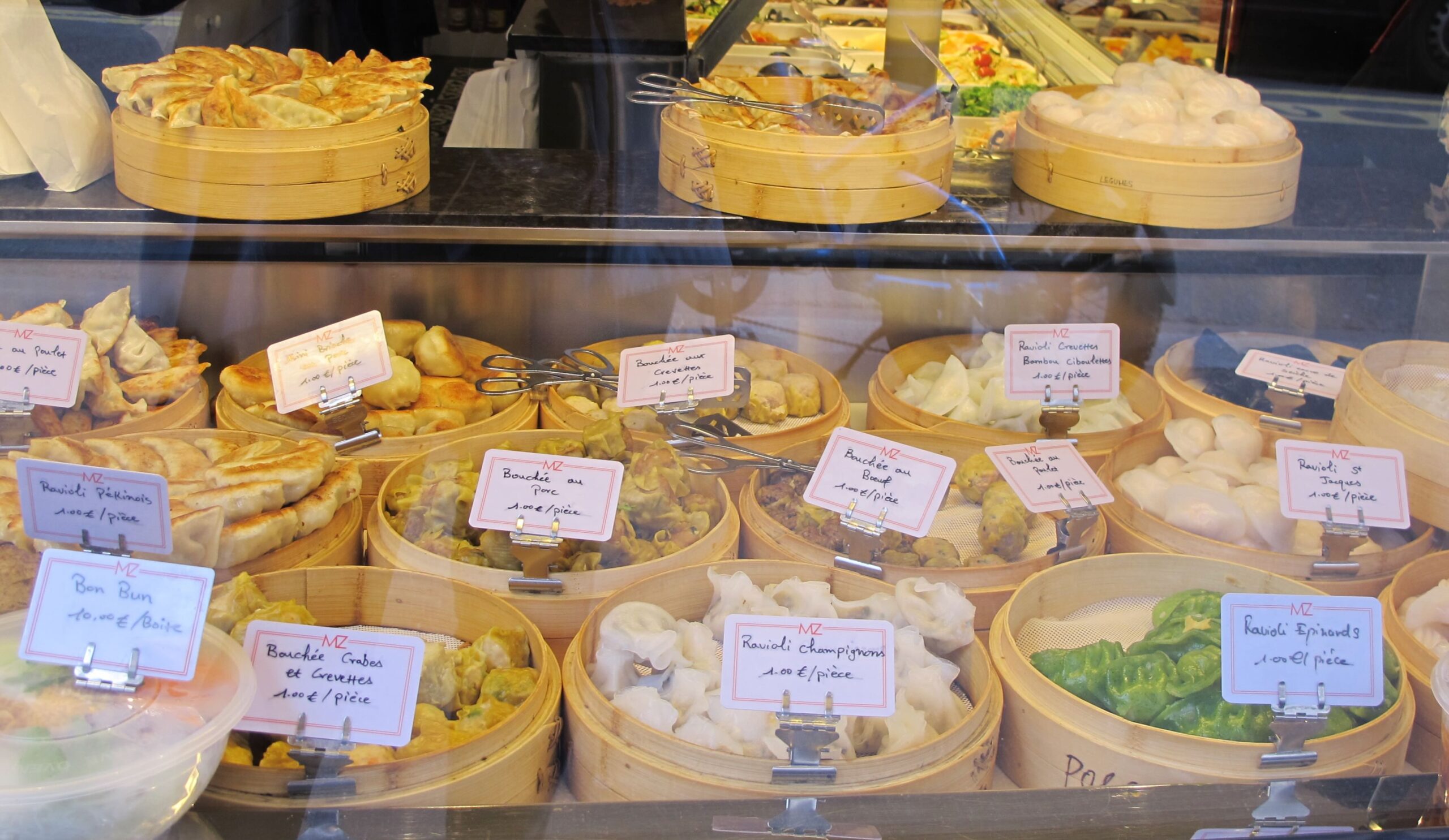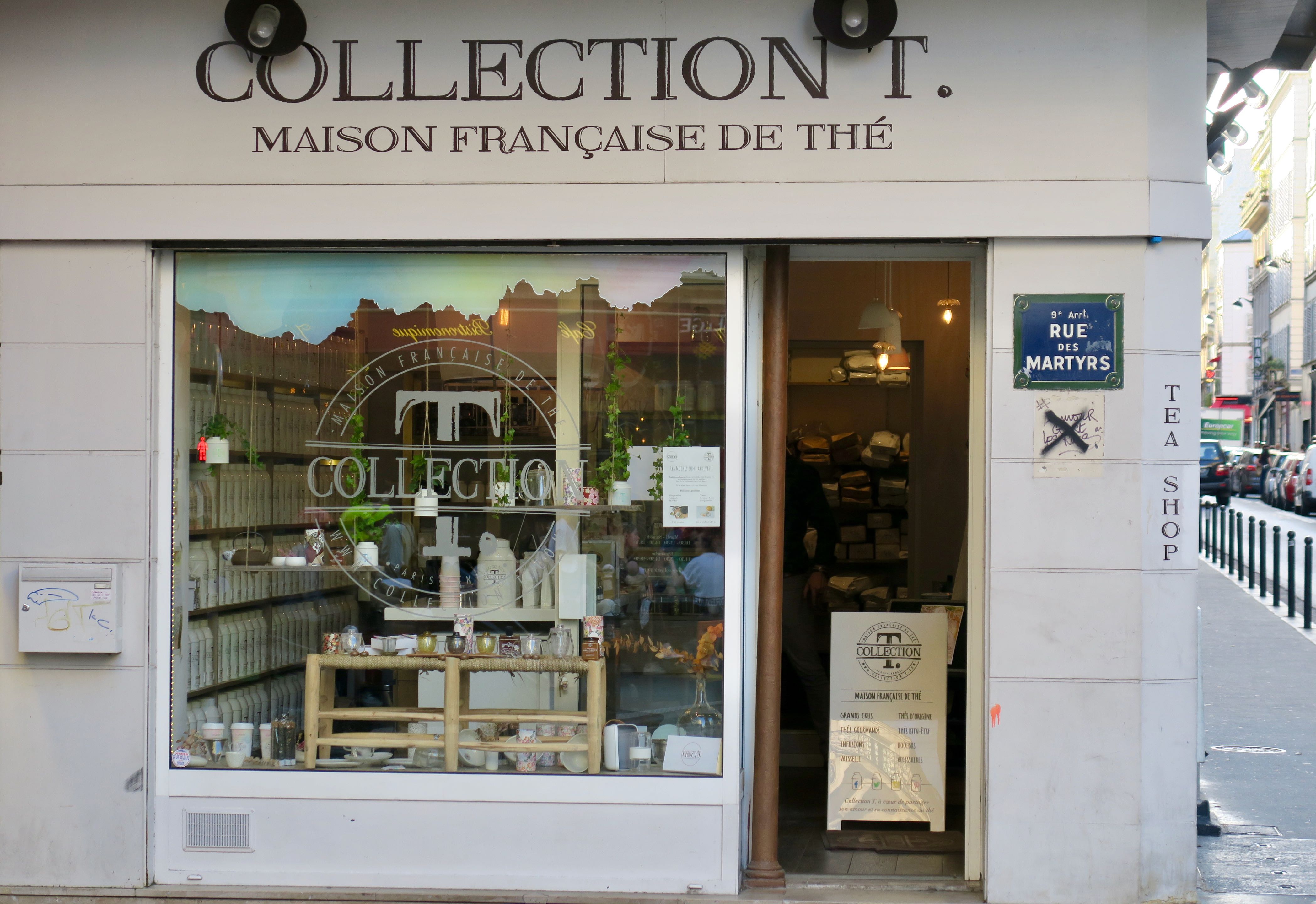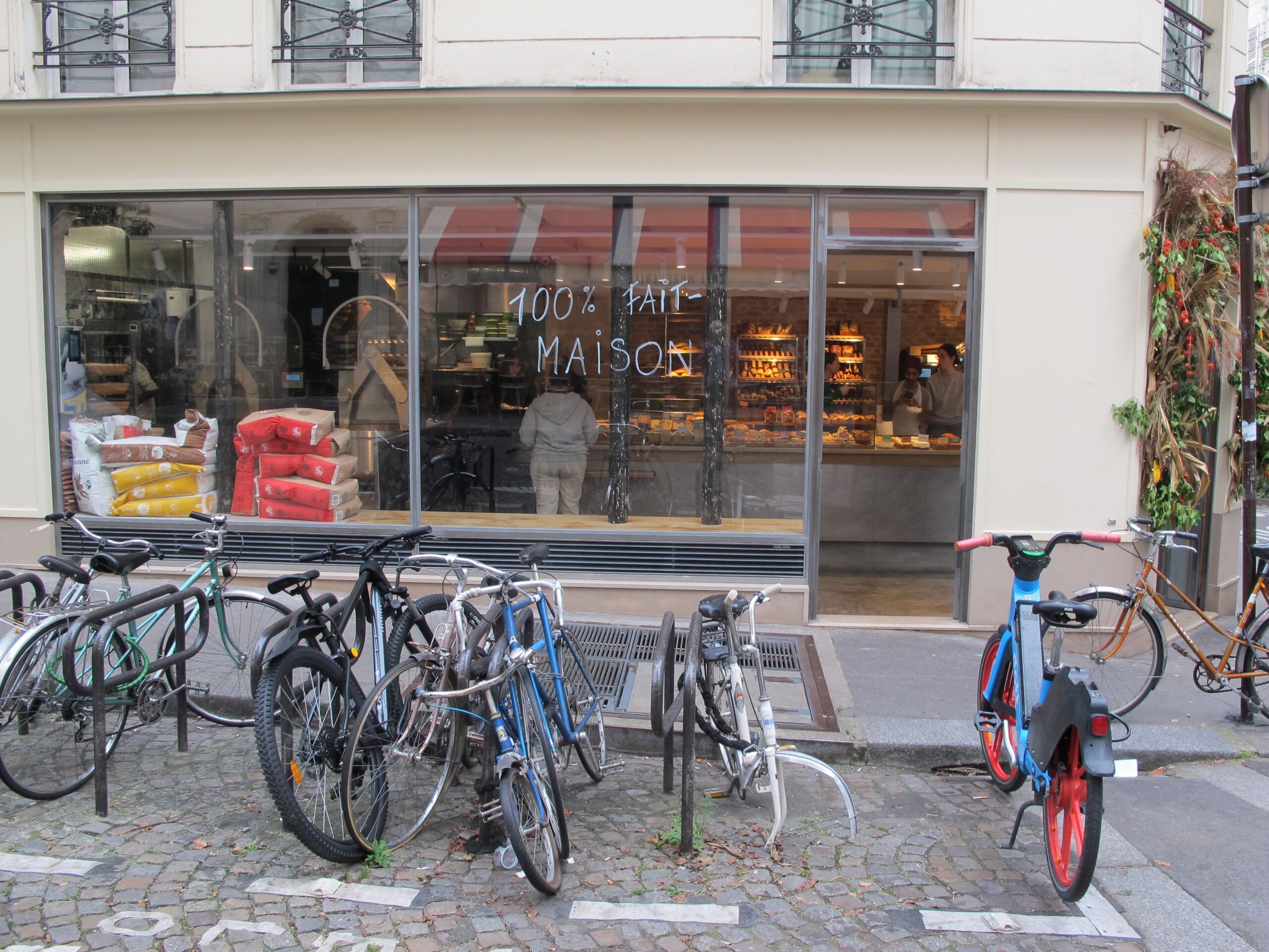 Wenn ich wieder durch die Rue des Martyrs bummele, fallen mir Neuzugänge und geschlossene Läden auf, so gibt es den Teeladen der Collection T nicht mehr, dafür in Nummer 13 nach wie vor die Filiale von »Palais des Thés« mit grüner Fassade und grünen Verpackungen. Ich mache allerdings nicht jedesmal eine komplette Bestandsaufnahme, jetzt im Herbst 2024 fiel mir neben der renovierten Reklame über dem Obst- und Gemüsehandel vor allem ein Feinkostgeschäft auf, das als Fédération Française de l’Apéro ganz auf Bleu-Blanc-Rouge setzt (Nr. 18). Neu erschien mir ebenso die Bäckerei »Le Pain retrouvé« gleich nebenan mit Kundenandrang bis auf die Straße und dem Hinweis 100 % fait maison im Fenster (Nr. 18). Auch im traiteur asiatique »Maison Zhang« war die Nachfrage nach Dim Sum beachtlich (Nr. 16).