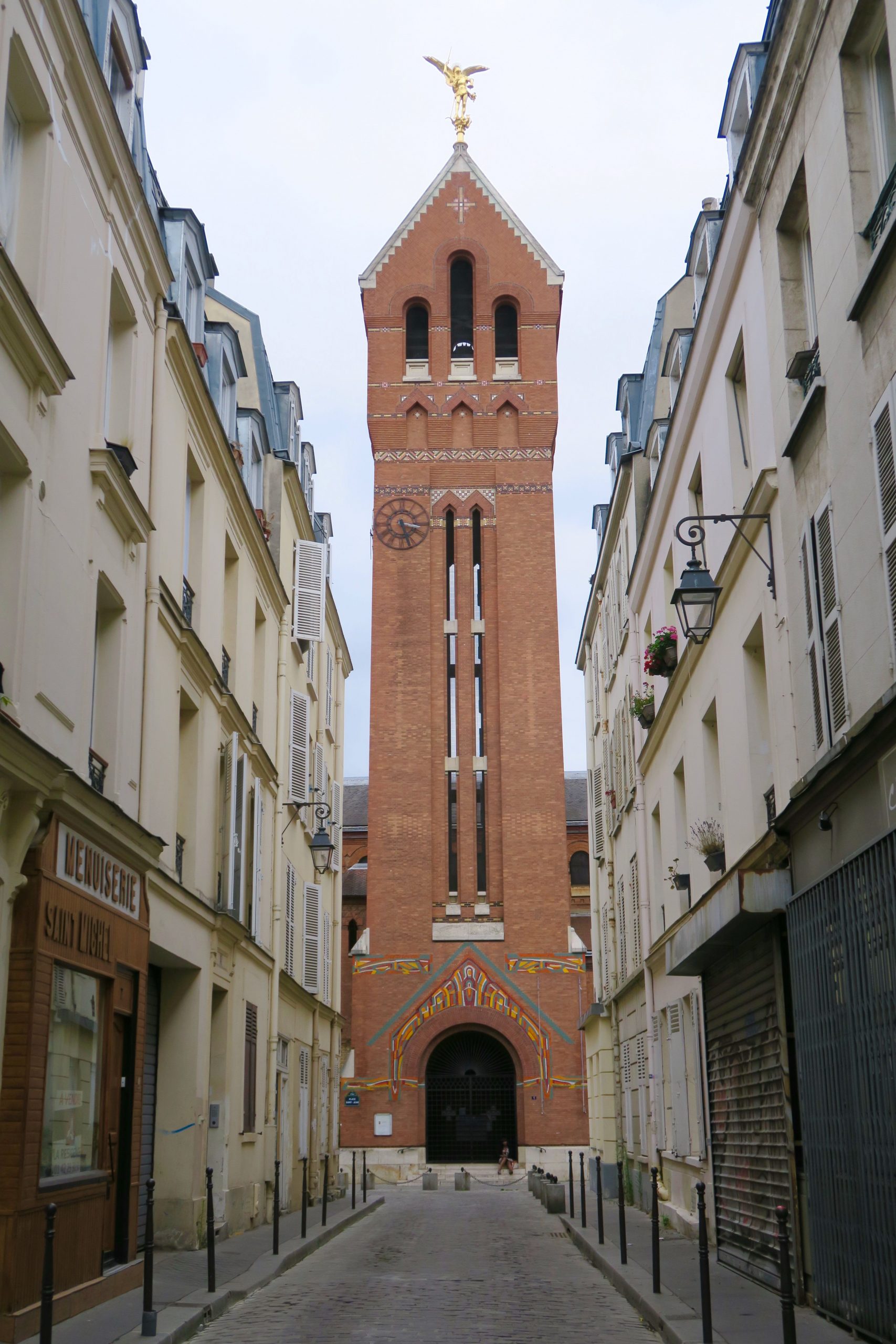 Saint-Michel des Batignolles: Immer die Backsteinkirche im Blick schlendern wir durch die Passage Saint-Michel, ihr Glockenturm aus den 1930er-Jahren bildet genau das Ende der Sichtachse. Der goldene Erzengel Michael ist eine Replik der Statue auf dem Klosterberg Mont Saint-Michel, beide wurden vom selben Bildhauer angefertigt. Durch die Rue Saint-Jean und die Rue Jacquemont erreicht man die Rue Lemercier. Das Lokal Bon Coin ist schon wieder eine nette Einkehradresse, und es folgen noch viele weitere, mit Les Puces des Batignolles schon die nächste an der Ecke zur Rue Legendre, der belebten Einkaufsstraße des Viertels mit hübschen Boutiquen und Fachgeschäften wie der Crèmerie du 17ème. Vorbei an der kleinen Markthalle von Batignolles geht es leicht abschüssig hinunter zum großen neuen Park Clichy-Batignolles.