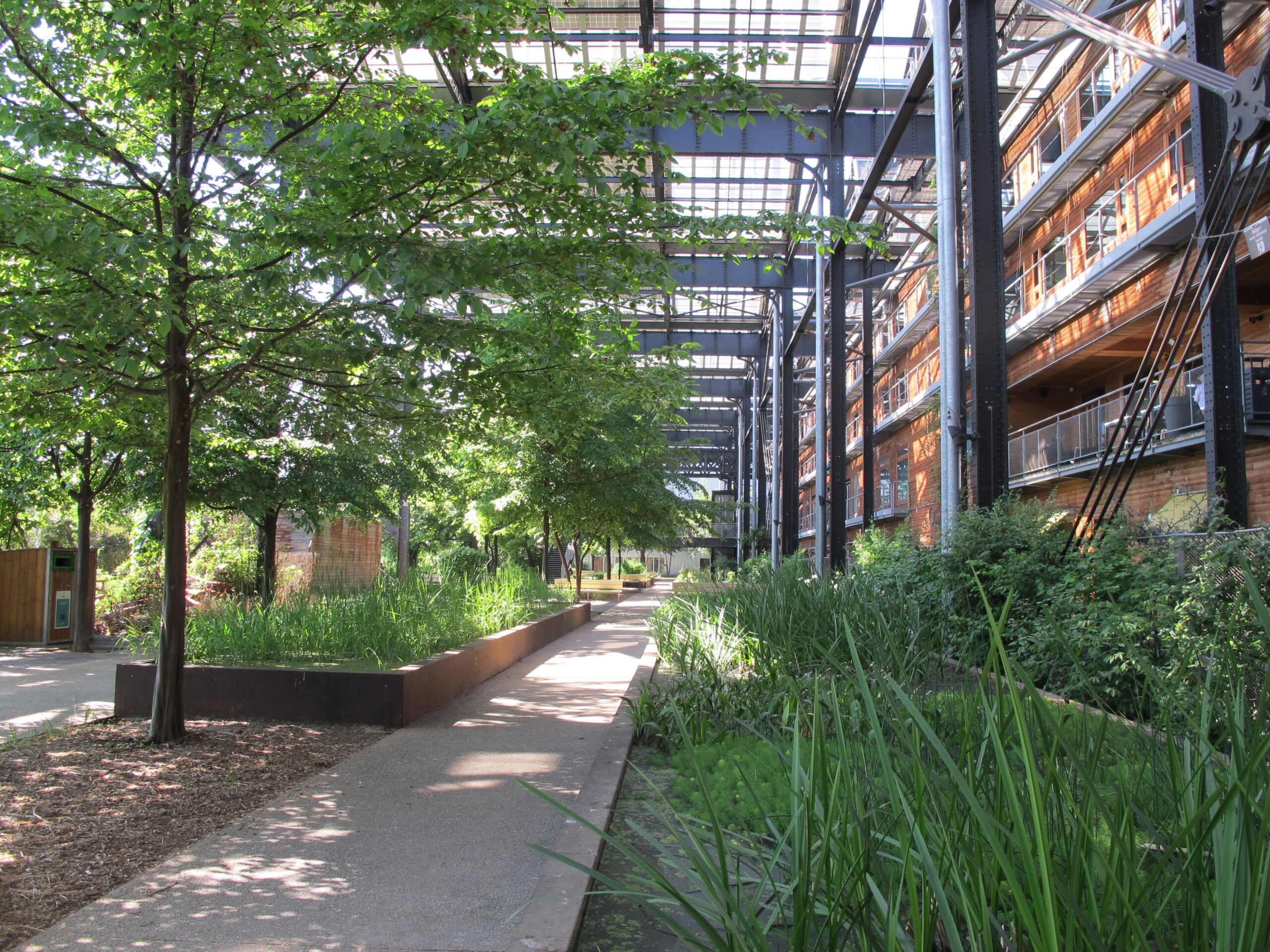 Zac Pajol: ZAC steht für »Zone d’aménagement concerté« und bezeichnet städtebauliches Erschließungsgebiet. Bahngelände und Bahnbauten wurden zum ökologischen Stadtteil umgewidmet, allerdings erst nach mehr als zwei Jahrzehnten der Verhandlungen. Im »écoquartier« entstanden Sportanlagen, ein Gebäude bezog die Universität, in den ehemaligen »Messageries«, einem Art-Déco-Bau für den Paketdienst, kam ein Collège unter. Dahinter gelangt man zur 1926 erbauten Halle Pajol, einem 196 Meter langen Güterverkehrsbau mit markantem Sheddach, das unter der Ägide der Architektin Françoise-Hélène Jourda energieeffizient umgebaut wurde und in dem unter anderem eine Jugendherberge und die Bibliothèque Vaclav Havel unterkamen. 3500 Quadratmeter Sonnenkollektoren auf dem Dach, Regenwassernutzung und recycelte Materialien sind dabei nur Teilaspekte des ökologischen Umbaus mehrerer Gebäude. Der Platz davor, die Esplanade Nathalie Sarraute, ist ein Teil der Pariser Kampagne, mehr Straßen, Plätze und Haltestellen nach Frauen zu benennen. Konsequent heißt daher der überdachte, 2014 geschaffene Garten entlang der Halle Jardin Rosa Luxemburg (dessen Name an die 1919 in Berlin ermordete Politikerin erinnert). Auf Fotos aus dem Jahr 2016 sind die frisch gepflanzten Bäume noch klein, jetzt haben Birken und Zedern deutlich an Höhe gewonnen und stoßen demnächst schon ans Dach.