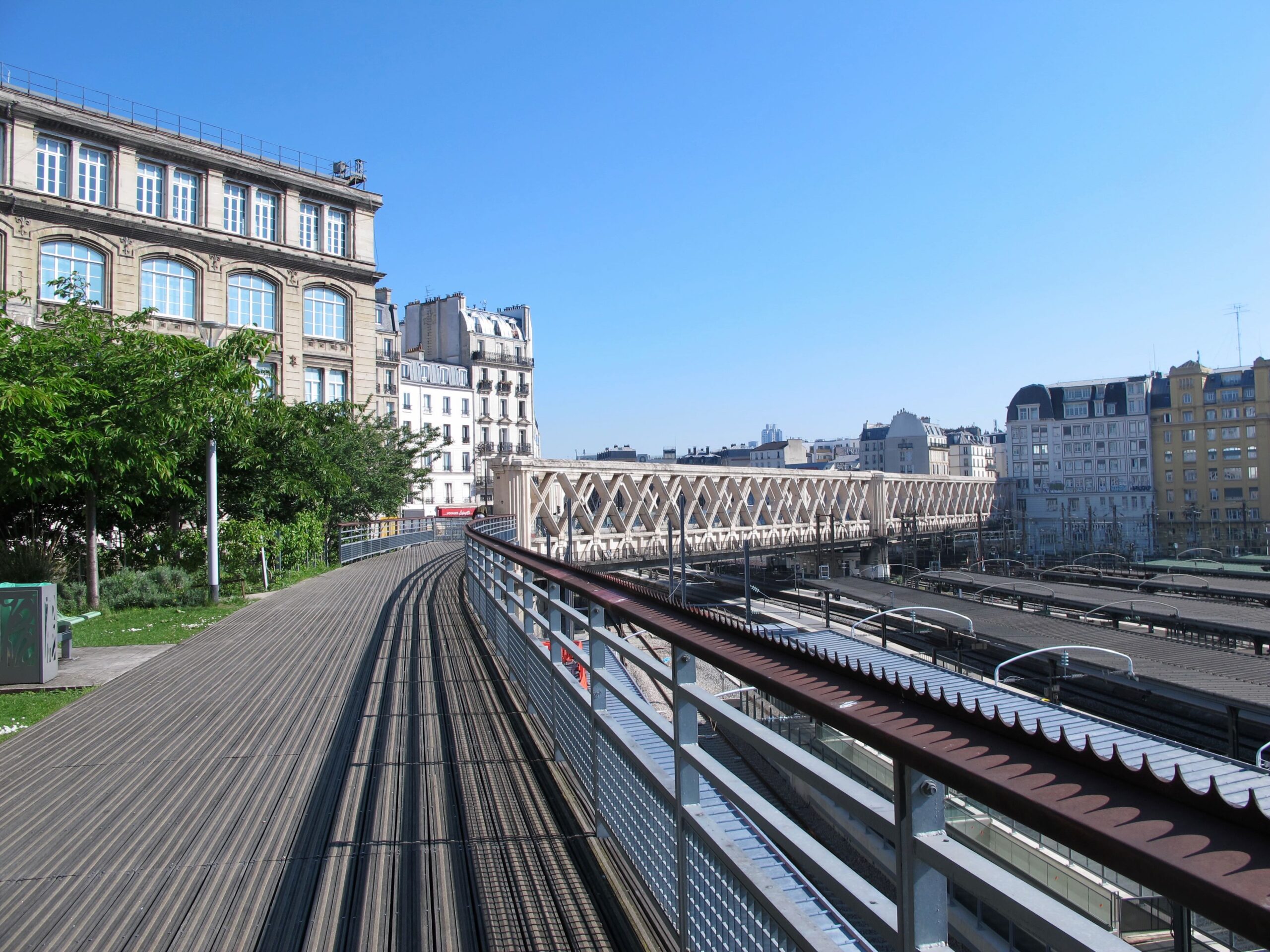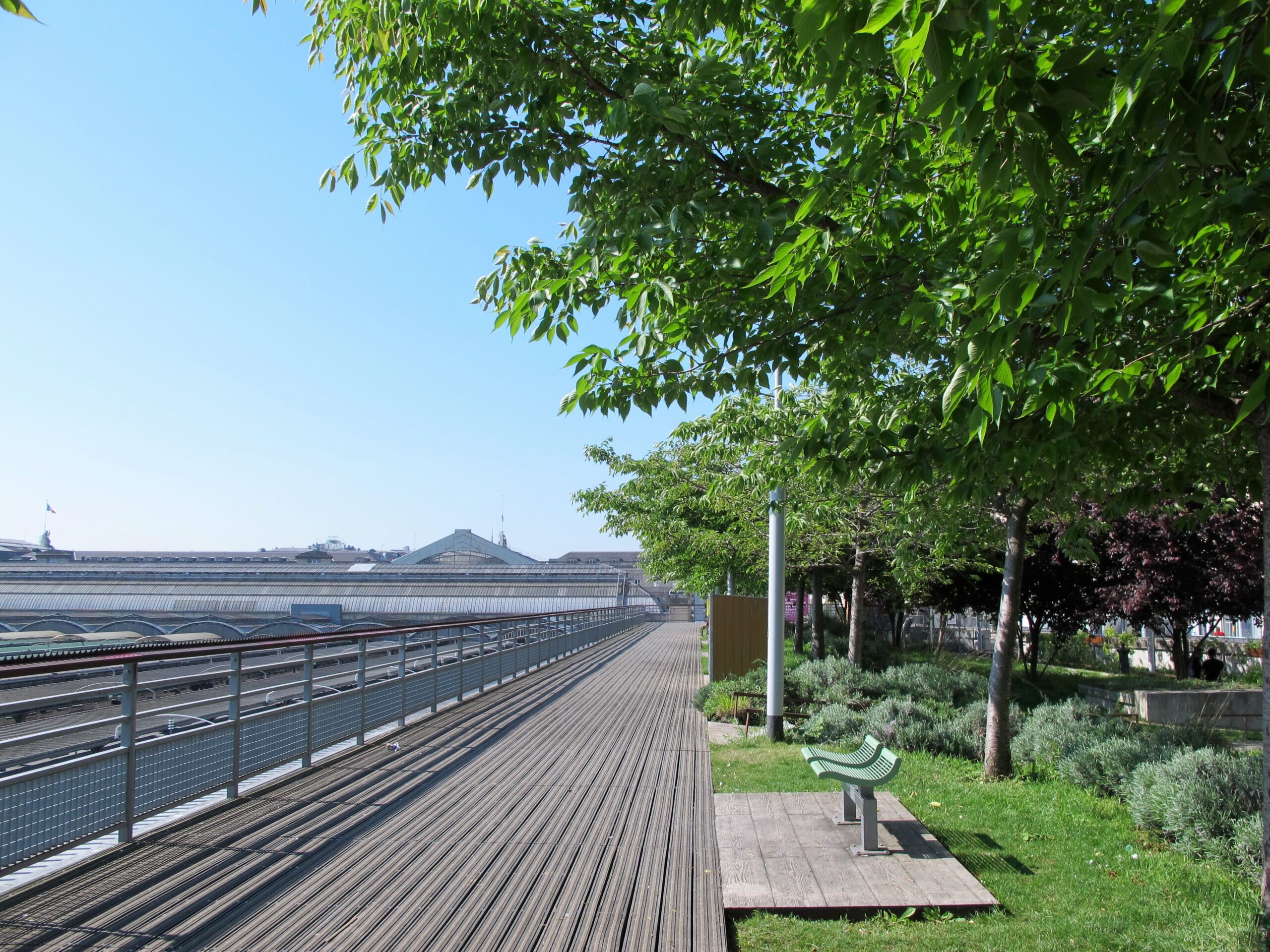 Jardin Marielle Franco: Durch den westlichen Seitenausgang des Bahnhofs geht es die doppelläufige Treppe hinauf, gleich rechter Hand liegt ein erster Garten. Angelegt wurde die kleine Grünanlage 2019 auf dem Dach des Okko-Hotels, in dem man direkt neben den Bahngleisen erstaunlich gut schläft. Selbst einige Weinreben und Obstbäume begrünen jetzt das Bahnhofsviertel, das zuvor eher eine Steinwüste war. Die namengebende Marielle Franco (1979 in Rio de Janeiro geboren und 2018 ermordet) engagierte sich für Frauen- und LGBTQ-Rechte und gegen Diskriminierung. Schon hier wäre erneut ein Einkehrstopp möglich, denn das Café Les Deux Gares profitiert von der sonnigen Lage auf der erhöhten Terrasse über dem Bahnhof. Biegt man etwas weiter nördlich in die Rue de l’Aquéduc, überquert man das erste Mal die Gleise.