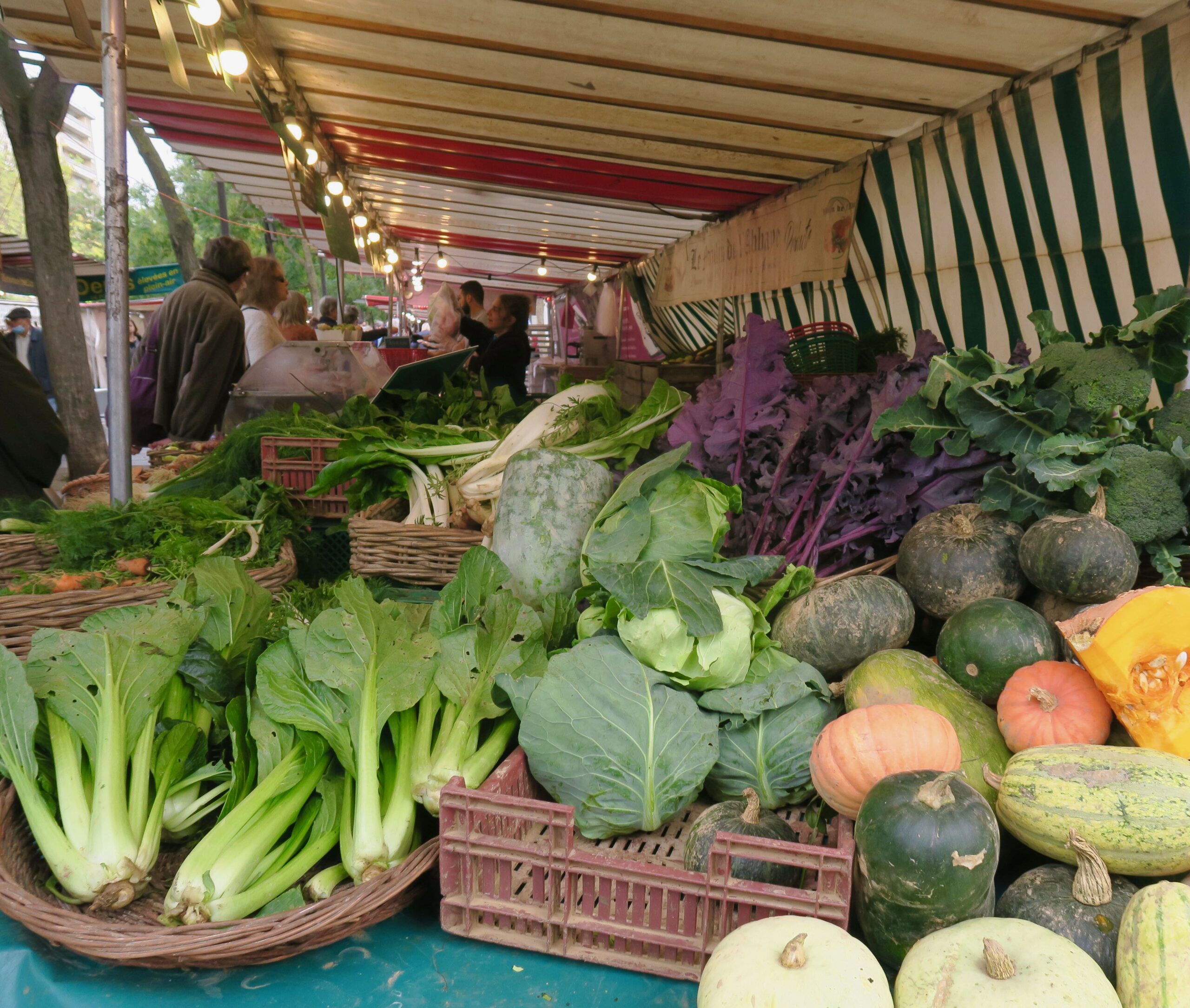 Pariser Wochenmärkte: Diesmal hatte ich ein Hotelzimmer im 11. Arrondissement gebucht, in der Rue Saint-Sabin. Um 10 Uhr kam der Zug pünktlich in der Gare du Nord an, mit der Métro war schnell das Gepäck abgeliefert und ich binnen kürzester Zeit in Paris unterwegs – besser geht es nicht. Pläne für den Tag hatte ich schon gemacht, doch auf dem benachbarten Boulevard Richard Lenoir war gerade Wochenmarkt, keine Frage, dafür das Programm zu ändern! Mit mehr als hundert Ständen ist der Marché Bastille einer der größeren von rund 80 Märkten insgesamt in Paris. Am Donnerstag- und am Sonntagvormittag bieten Händler und Produzenten hier auf der von Bäumen gesäumten Promenade ihre Waren an – mit Blick auf die geflügelte Figur der Freiheitssäule auf der Place de la Bastille. Das vielfältige Angebot macht den Markt zu einem der belebtesten der Stadt, Anwohner und Touristen schätzen ihn gleichermaßen. Bei Letzteren weniger bekannt ist die Tatsache, dass viele der Stände am Dienstag und Freitag erneut auf dem Boulevard Richard Lenoir anzutreffen sind, nur ein kleines Stück weiter nördlich auf Höhe der Rue Oberkampf als etwas kleinerer Marché Popincourt. Wer gemütlich entlang der Stände schlendern und auch einkaufen möchte, kommt am besten nicht gerade zwischen 11 und 12 Uhr. Für jedes Produkt stehen mehrere Stände zur Auswahl und zum Vergleich, ob Fisch und Meeresfrüchte, Fleisch und Wurst, Käse und Molkereiprodukte, Biolebensmittel oder Obst und Gemüse frisch vom Acker. Mein Lieblingsstand ist »Le Moulin de l’Abbaye« mit ausgefallenen Salat-, Kräuter- und Gemüsesorten.
