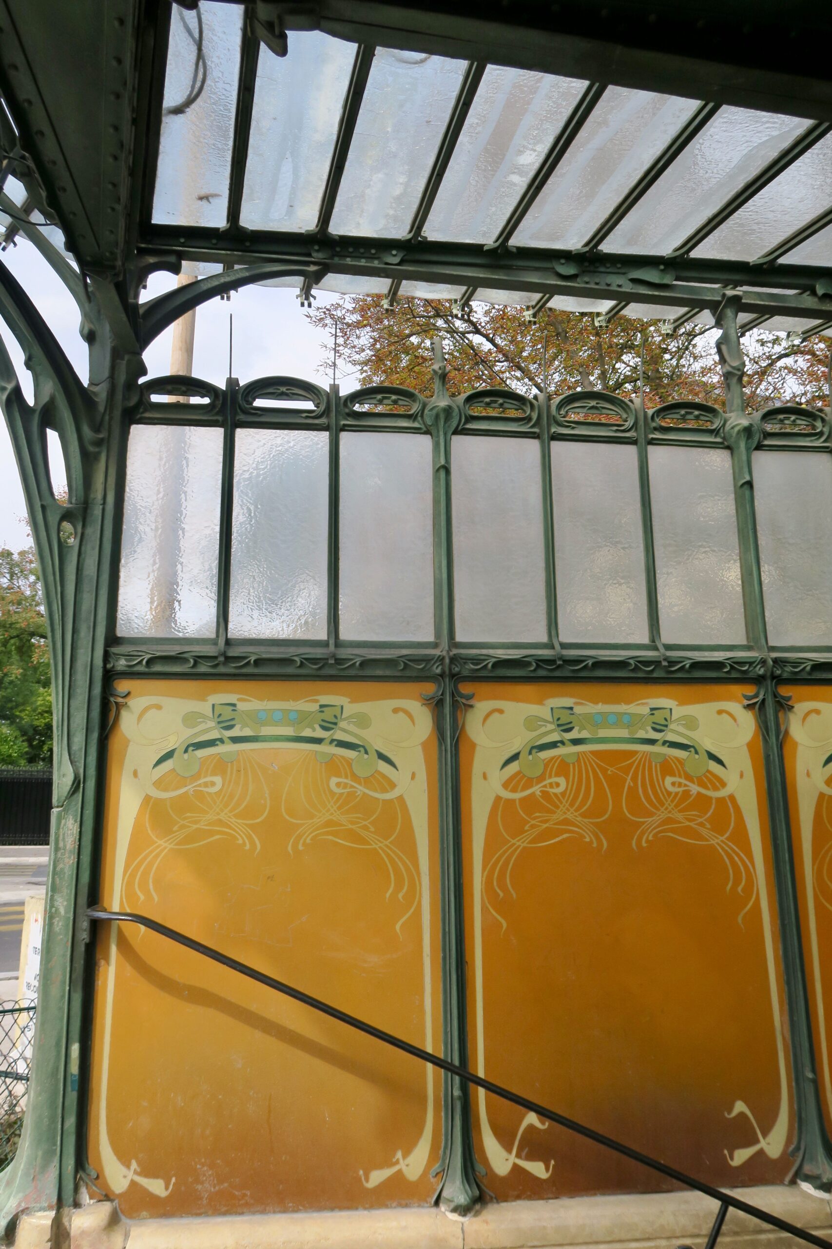 Art Nouveau: Einer der ältesten Jugendstil-Eingänge zu den Métrostationen ist die Station Porte Dauphine (16e) – sie gehört zu den wenigen, die noch ihr Glasdach besitzen. Das denkmalgeschützte Zugangsbauwerk, Endstation der Linie 2 an der Porte Dauphine, ist das einzige, das noch an seiner ursprünglichen Stelle steht. Der U-Bahnhof wurde am 13. Dezember 1900 in Betrieb genommen, heute trägt die Station den Namenszusatz »Maréchal de Lattre de Tassigny« nach einem an der Befreiung Frankreichs beteiligten Kommandanten im Zweiten Weltkrieg. Denn die glasüberdachten Eingänge zu den Métrostationen Abbesses (18e) und Châtelet (1er) sind keine Originale, sondern Ersatzdarsteller: Ursprünglich für den Eingang der Métrostation Hôtel de Ville in der Rue Lobau gebaut, wurde die Überdachung 1974 von ihrem damaligen Standort auf den Montmartre versetzt – eigentlich ein Anachronismus, da es diese Eingänge an der (neueren) Linie 12 gar nicht gab. Und die Zugangsüberdachung zur Station Châtelet auf der Place Sainte-Opportune ist gleich ganz eine Rekonstruktion (nach dem ehemaligen Eingang zur Métro an der Gare de Lyon) – entstanden zur Hundertjahrfeier der Métro im Jahr 2000. Bei vielen anderen Stationen stehen nur noch offene Varianten, bestehend aus Geländer und Kandelaber an den Eingängen – sie wurden schon seriell aus Gusseisen gefertigt, in verschiedenen Breiten. An etwa 65 Stationen sind noch solche Eingänge erhalten, viele weitere wurden in der zweiten Hälfte des 20. Jahrhunderts abgebaut und ersetzt.