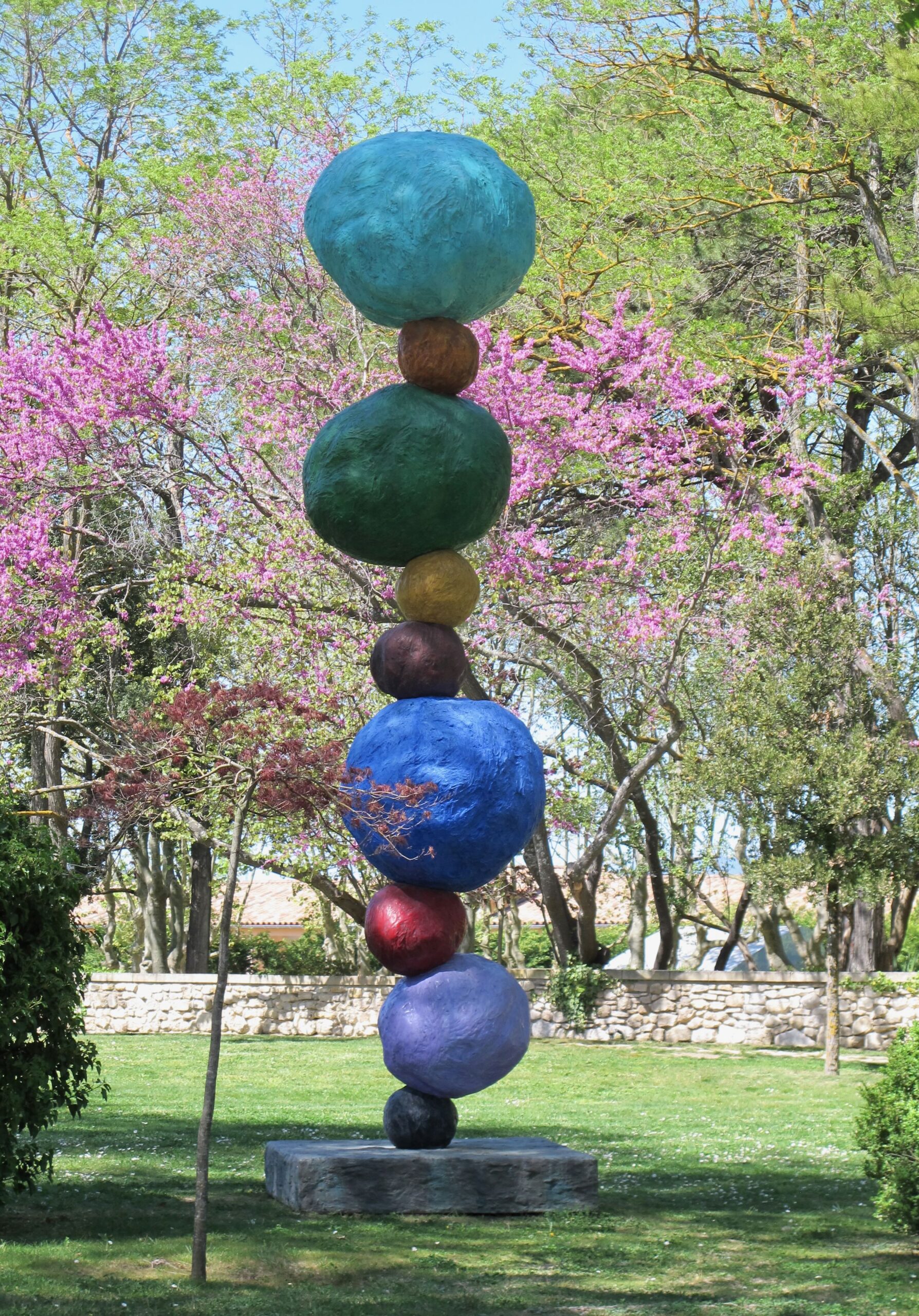 Parcours Art et Architecture: Zwei bis drei Stunden Zeit sollte man für den Spaziergang auf jeden Fall einplanen, um Kunst und Architektur im Freien auf sich wirken zu lassen. Ausgerüstet mit dem Infoheft samt Plan begegnet man den prominenten Namen der zeitgenössischen Kunstwelt, darunter Daniel Buren, Alexander Calder, Per Kirkeby, Sean Scully und anderen. Die nachhaltigsten Eindrücke hinterlassen die Arbeiten, die nicht wie einfach in die Landschaft gestellt wirken, sondern auf sie Bezug nehmen. So etwa gleich zu Beginn des Rundgangs die »Donegal« genannten Steinbrücken von Larry Neufeld wie auch »Ruyi Path« des chinesischen Künstlers Ai Weiwei: Die Pflastersteine für den geschwungen Weg stammen aus dem Hafen von Marseille, der über viele Jahrhunderte hinweg ein wichtiges Tor nach Europa war, sie stehen symbolisch für das Thema Flucht. Für den Steinkreis von Richard Long mit dem Titel »Circle of Riverstones« wiederum stammt das Material aus der nahen Durance. An einer Böschung ließ Richard Serra seine mehrere Meter hohen Cortenstahl-Wände »Aix« in den Hügel eingraben. Ein Vertreter der Land Art ist Andy Goldsworthy, der für seine Arbeiten vergängliche Naturmaterialien verwendet, für »Oak Room« 12.000 Eichenstöcke aus dem Burgund. Der häufig mit Kugeln aus Murano-Glas arbeitende Jean-Michel Othoniel schuf neben der kleinen Kapelle mit »La Grande Croix Rouge« ein rotes Kreuz, dessen Farbe das Rot des Weins aufnimmt wie sich auf die Transsubstantiation der katholischen Kirche bezieht, die Verwandlung von Brot und Wein in Leib und Blut Christi. Mehr noch als an der Kunst erfreut man sich an ihrem Zusammenspiel mit dem Naturerlebnis zwischen Olivenbäumen, Wein und mediterraner Vegetation. Als eine Hommage an die provenzalische Landschaft kann auch der Ausstellungspavillon von Richard Rogers verstanden werden: den weit über einen Abhang hinausragenden, an einen Container erinnernden Bau betritt man über eine Gangway. Die dem Eingang gegenüberliegende Glasfront wirkt wie ein weiteres Bild – das Motiv ist die umgebende Landschaft.