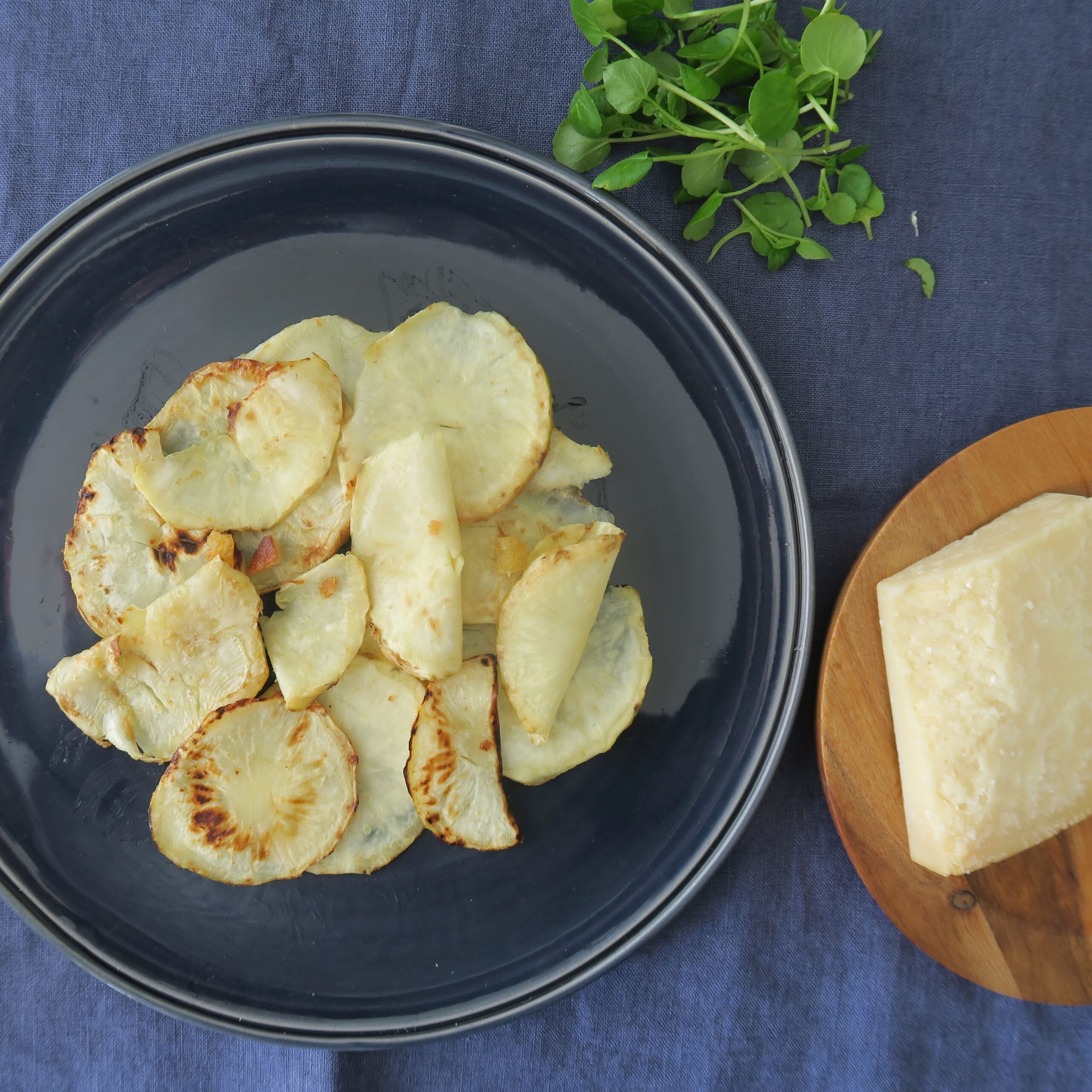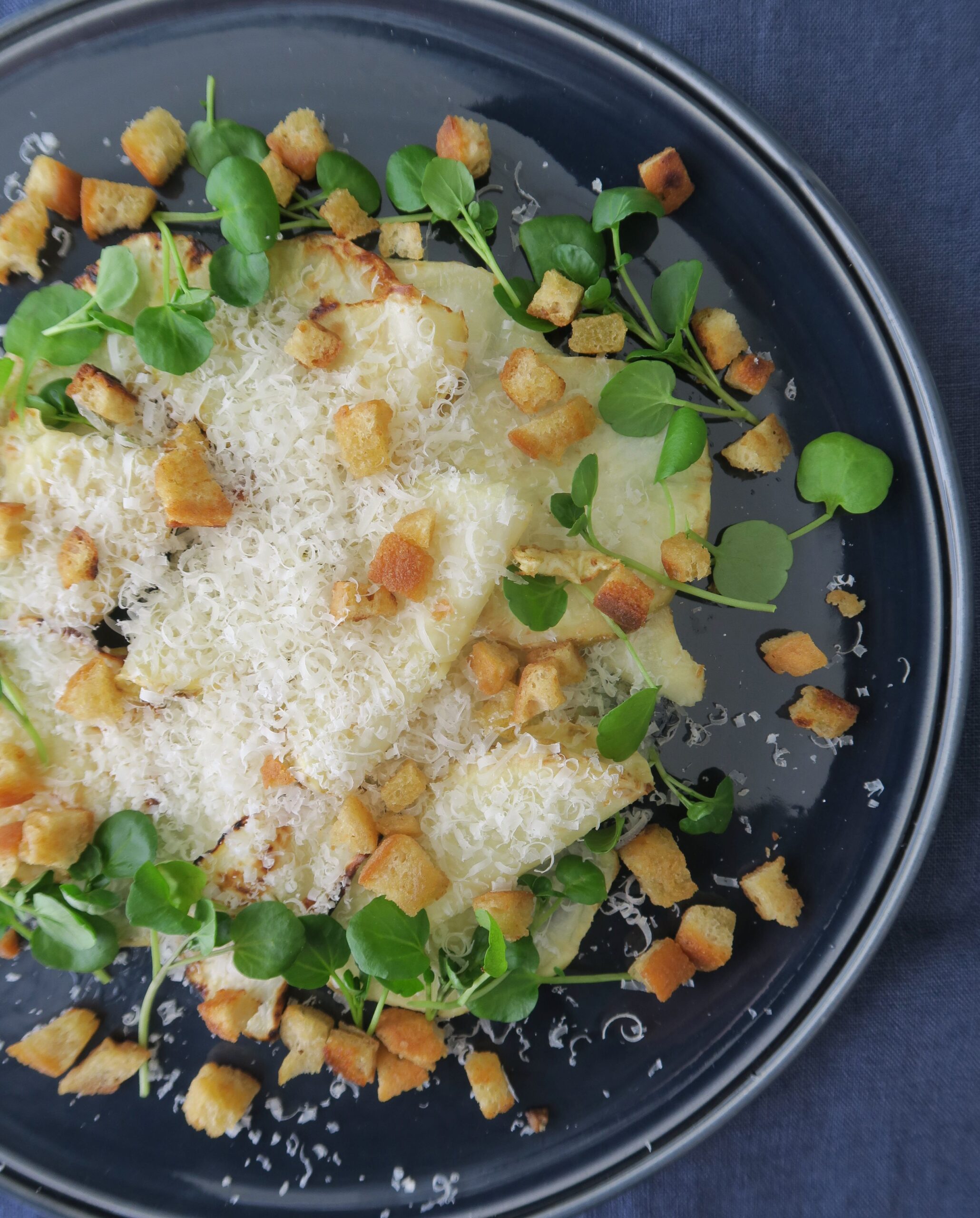 Aufgeschnitten: Das Wurzelgemüse kann roh gegessen, gekocht und gebraten werden. Für fast alle Rezepte wird Knollensellerie geschält, man kann ihn aber auch in der abgebürsteten Schale zubereiten, ob in der Pfanne, im Ofen oder in der Salzkruste. Meine Lieblings-Selleriecremesuppe verfeinere ich mit geriebenem Parmesan und gerösteten Brotwürfelchen, das schmeckt auch – sozusagen dekonstruiert – als Carpaccio aufgeschnitten (und man spart sich die Kalorien der Sahne). Mit Parmesan und Croutons bestreut wird eine schlichte Sellerieknolle so zum Hochgenuss. Für 2 Portionen: