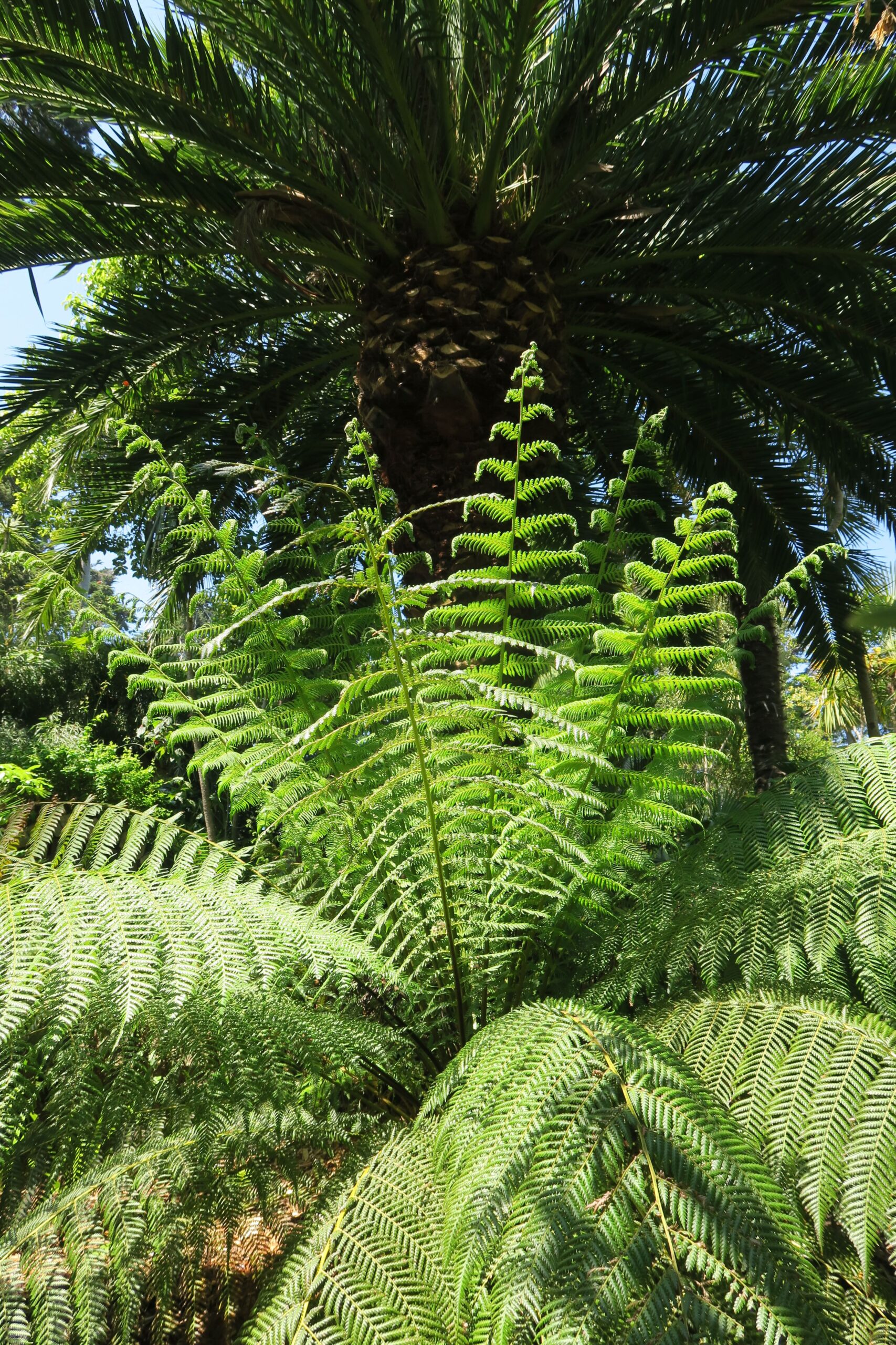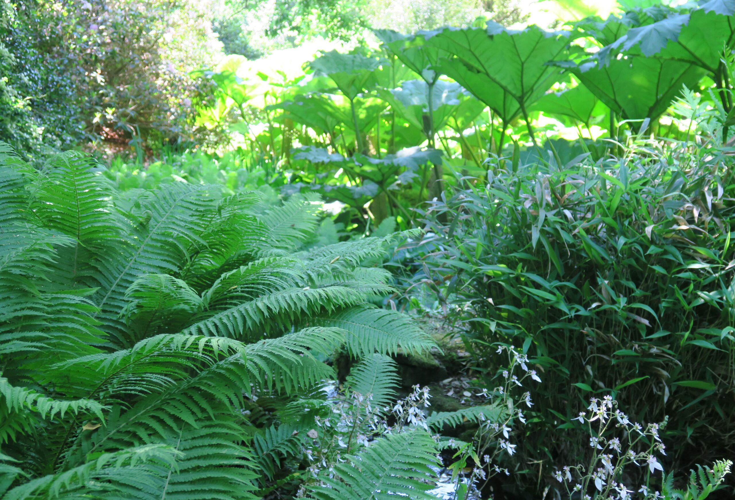 Schattengrün: Die in allen Abstufungen von Grün leuchtenden Farne gedeihen im Schatten von Gehölzen am besten, ihr natürlicher Standort ist der Wald. Typisch sind die vielfach geteilten, schwertförmigen Wedel, doch unter den zahllosen Arten reicht die Bandbreite von den Baumfarnen Neuseelands, die eher Palmen ähneln, bis zu so grazilen Arten wie dem Frauenhaarfarn. Manche sind immergrün, einige winterhart, viele sind giftig, andere sogar essbar, neben Bodenfarnen gibt es auch Epiphyten (Aufsitzer, die andere Pflanzen besiedeln) und Farne, die im Wasser wachsen. Anders als spektakuläre Blütenpflanzen stehen Farne als »Füllgrün« oft nicht im Mittelpunkt gärtnerischen oder botanischen Interesses. Grün ist als Gartenfarbe so selbstverständlich, dass Farne und Blattpflanzen wie Funkien gern als Hintergrund verwendet werden und noch den letzten schattigen Fleck begrünen. Dennoch fasziniert ihr Formenreichtum viele Menschen.
