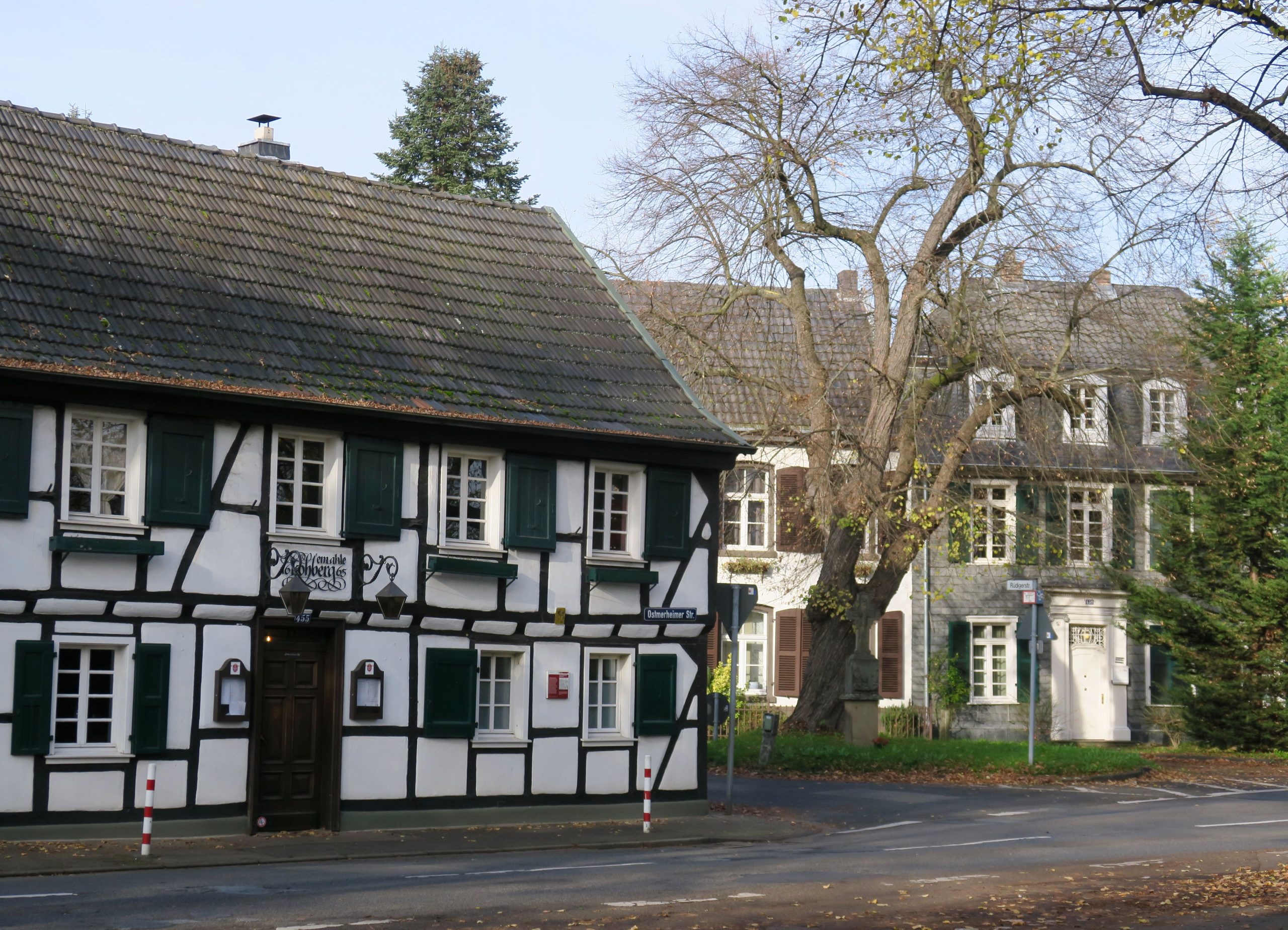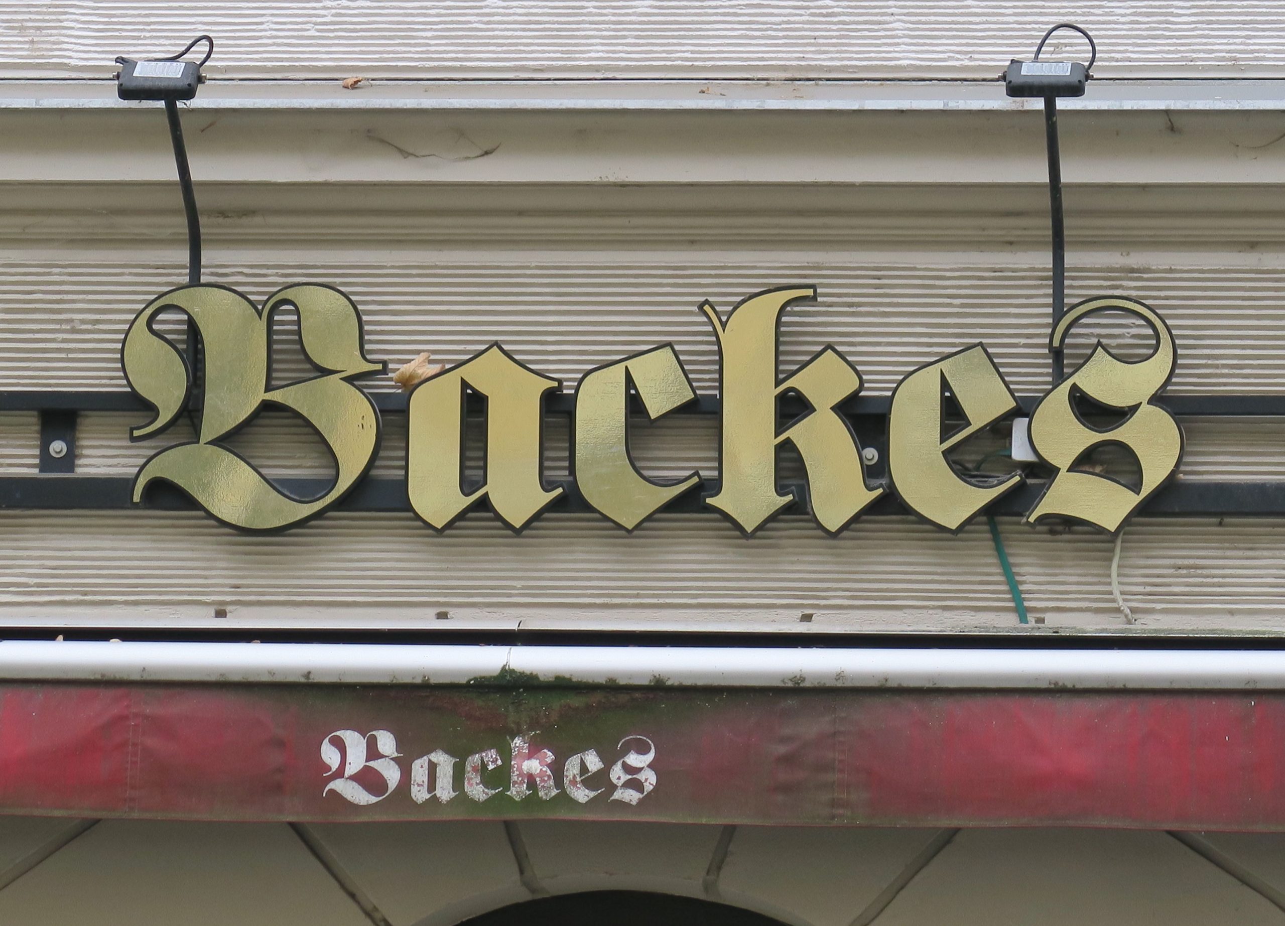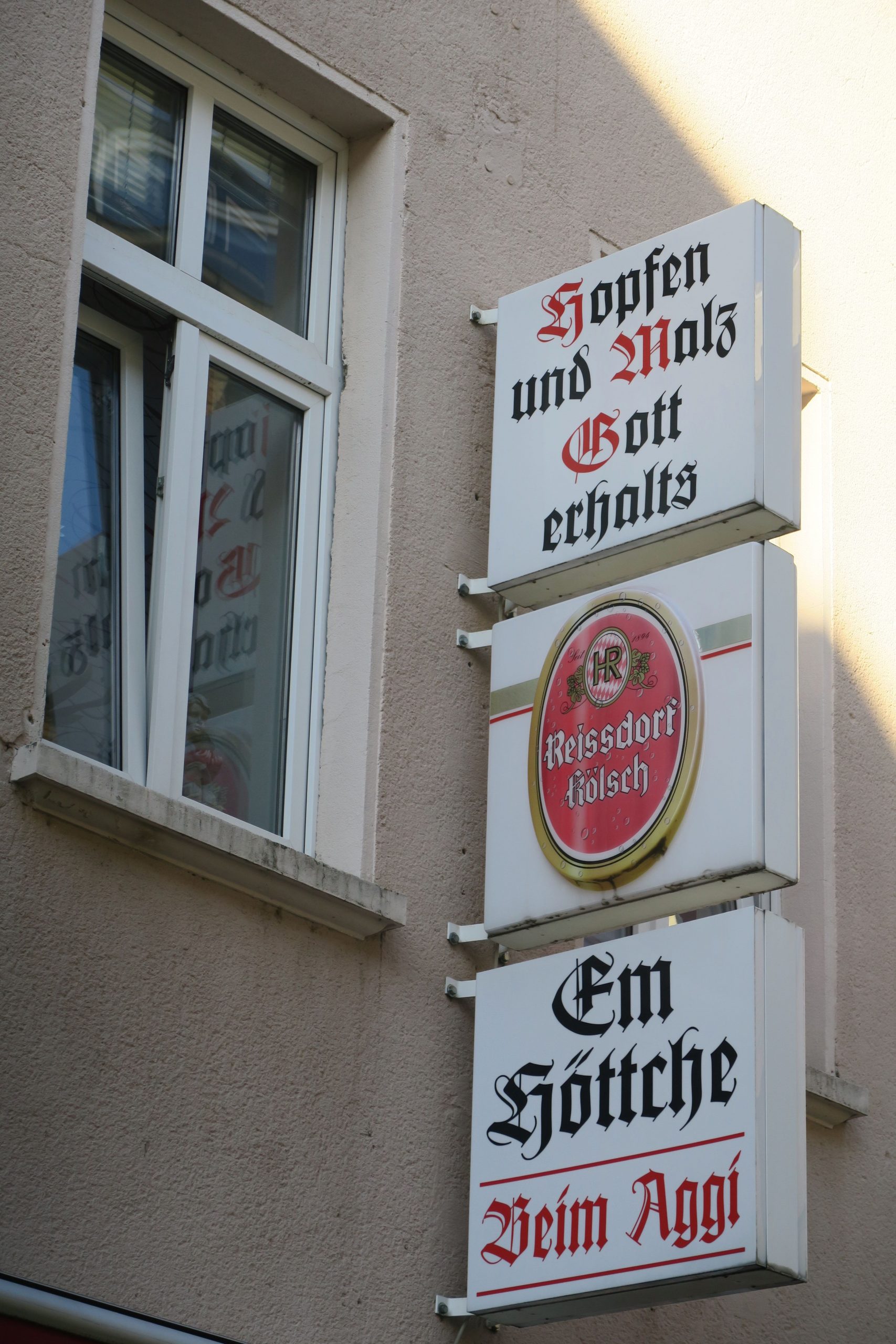 So wie dat fröher mol wor: So wie es mehr Konzernvorstände gibt, die Thomas heißen, als Frauen, gibt es in Köln vermutlich mehr Lokale mit italienischen Namen als mit kölschen. Manchmal ist allerdings beides »jlöcklich« vereint – wie beim »caffè felice«. Ein elementarer Teil der kölschen Kultur sind die Brauhäuser und die »Kaschämm«. »Jommer in en andere Kaschämm«, auch das sind erneut die Höhner mit ihrem Karnevalshit »Die Karawane zieht weiter«. Für Auswärtige tun sich da beim Singen auch mal Missverständnisse auf, meine bayrische Kollegin fragte sich, warum jemand in der Dachrinne lebt (läv in d’r Daach rin = lebe in den Tag hinein) und erfreute sich des Jodelns: »Dat es ne jode Lade – jode Lade – jode Lade – jode Lade – jode Lade he« (beides Höhner). Eigentlich bezeichnet der Begriff Kaschämm korrekt übersetzt eine Spelunke, ist in Köln aber freundlich gemeint und bedeutet Veedelskneipe. Und nur Letztere halten die kölsche Sprache bei der Namenswahl in Ehren, ob im »Höttche« (Hüttchen) oder »Stüffje / Stüffge« (Stübchen), im »Backes« (Backhaus), »Krützche« (Kreuzchen) oder beim »Kölsche Boor« (Kölner Bauern). Fast ausnahmslos wählen die Lokale »altdeutsche« Frakturschriften für ihre Beschriftungen – mit ihren charakteristischen verschnörkelten und teils leicht verwechselbaren Versalien sorgen die Buchstaben für eine historisierende Anmutung und sollen der Gaststätte wohl den Anstrich eines Traditionsbetriebs geben und Gemütlichkeit versprechen. Ob das noch funktioniert? »Im Schnörres« in der Südstadt traut man den Kölschkenntnissen nicht so ganz, das Ladenschild ist ein Schnurrbart. Dass auch Tradition und moderne serifenlose Schriften harmonieren, zeigen der »Golde Kappes« (Goldene Kohlkopf) in Nippes und der »Joode Lade« im Belgischen Viertel. Und ganz und gar keine Kaschämm ist das Restaurant »Am ahle Kohberg« – das schöne Fachwerkhaus mit Biergarten beherbergt die älteste Gaststätte Merheims.